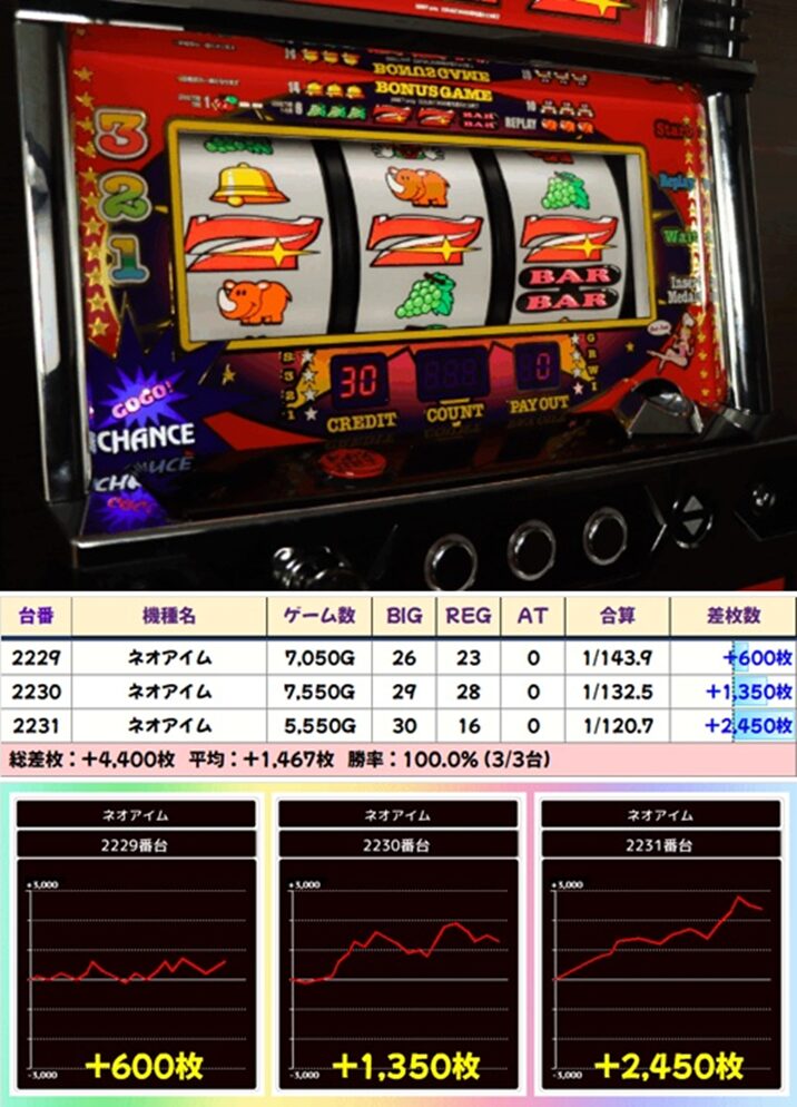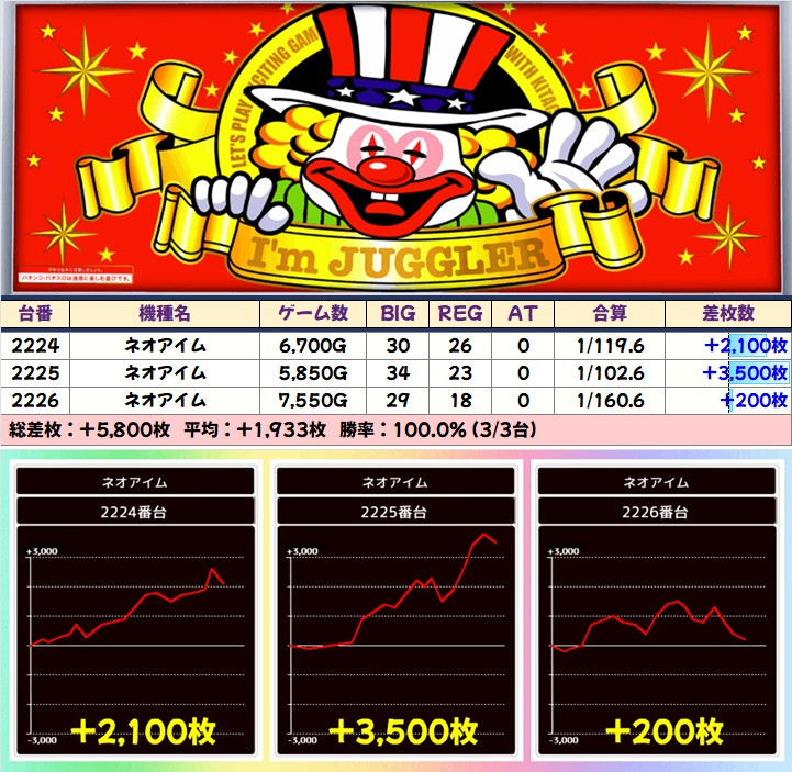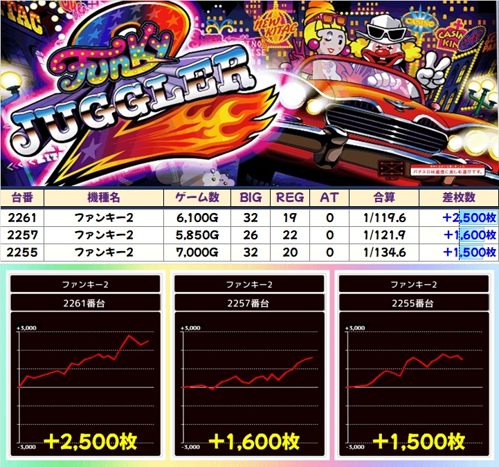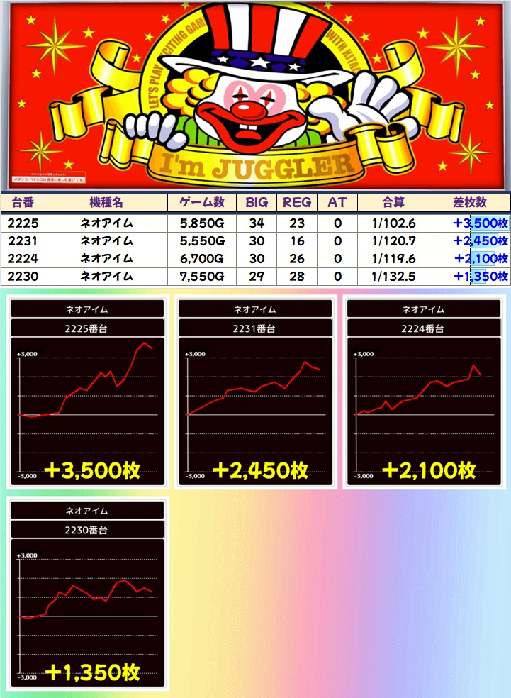 『独り言』関連機種のジャグシリーズから「ネオアイム」&「ファンキー2」&「ゴージャグ3」と多くの機種が1/2系に! 「ネオアイム」の+3500枚、「ファンキー2」の+2500枚など各機種に優秀台あり!