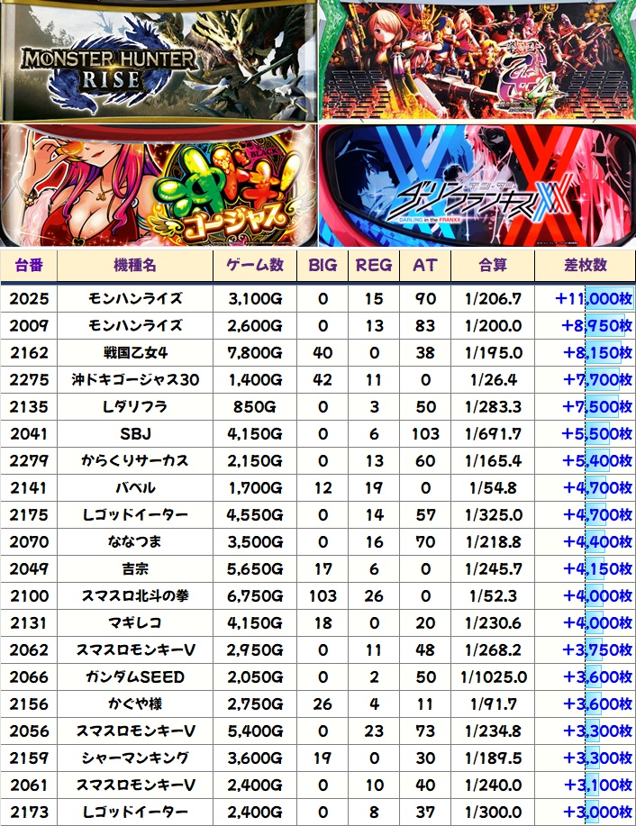 前述した仕掛け以外にも、「モンハンライズ」の万枚&+8950枚、「モンキーV」の+3000枚×3台など、単品優秀台も充実!