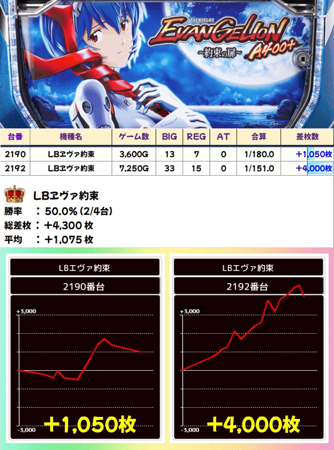 エヴァ(2/4台+)➡平均+1,075枚