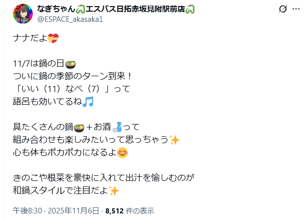 公式Xでは「なぎちゃんの独り言」もしっかり発動。公式Xのお知らせは大体20時に、そこから30分後に独り言がポストされる傾向にあるので、しっかりチェックしておきましょう。