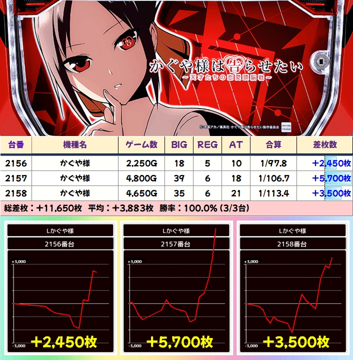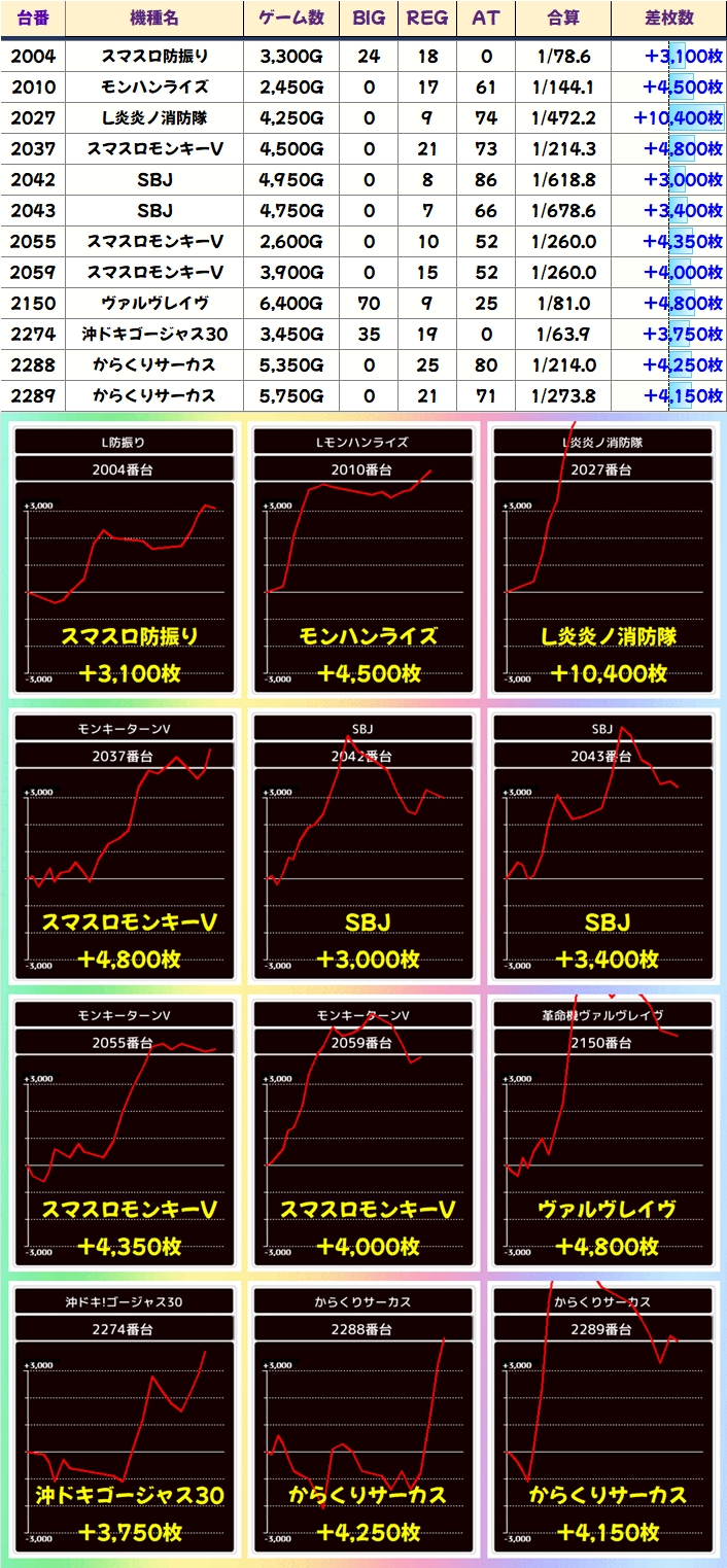 この日は「万枚オーバーが大量5台、+3000枚以上が42台、+1000枚以上が83台」と店内各所で盛り上がりをみせていました!