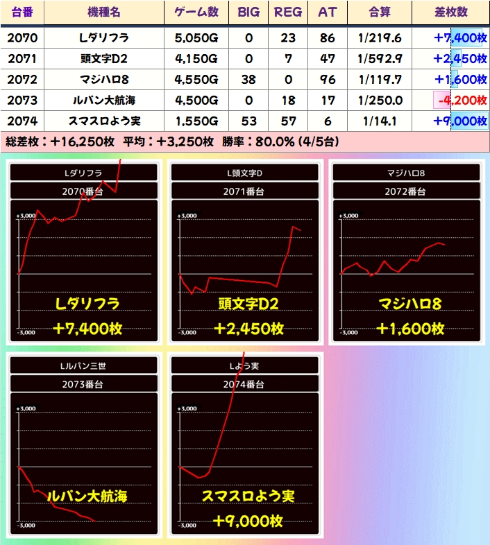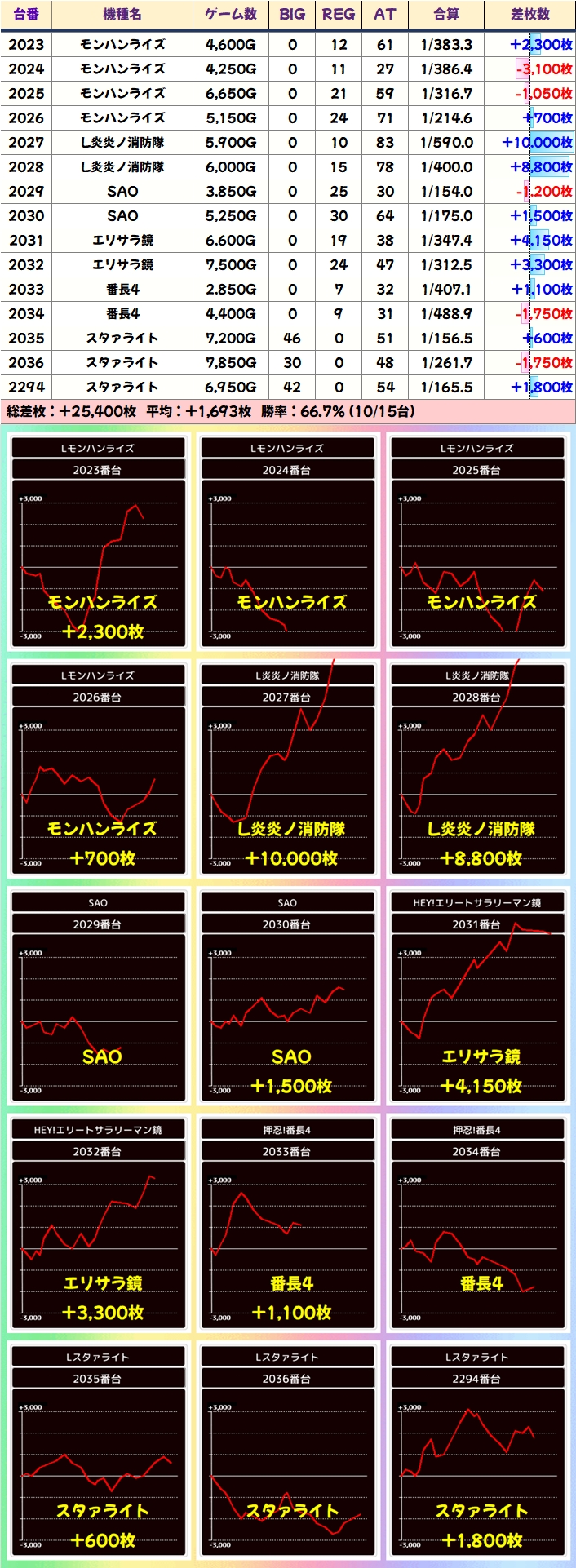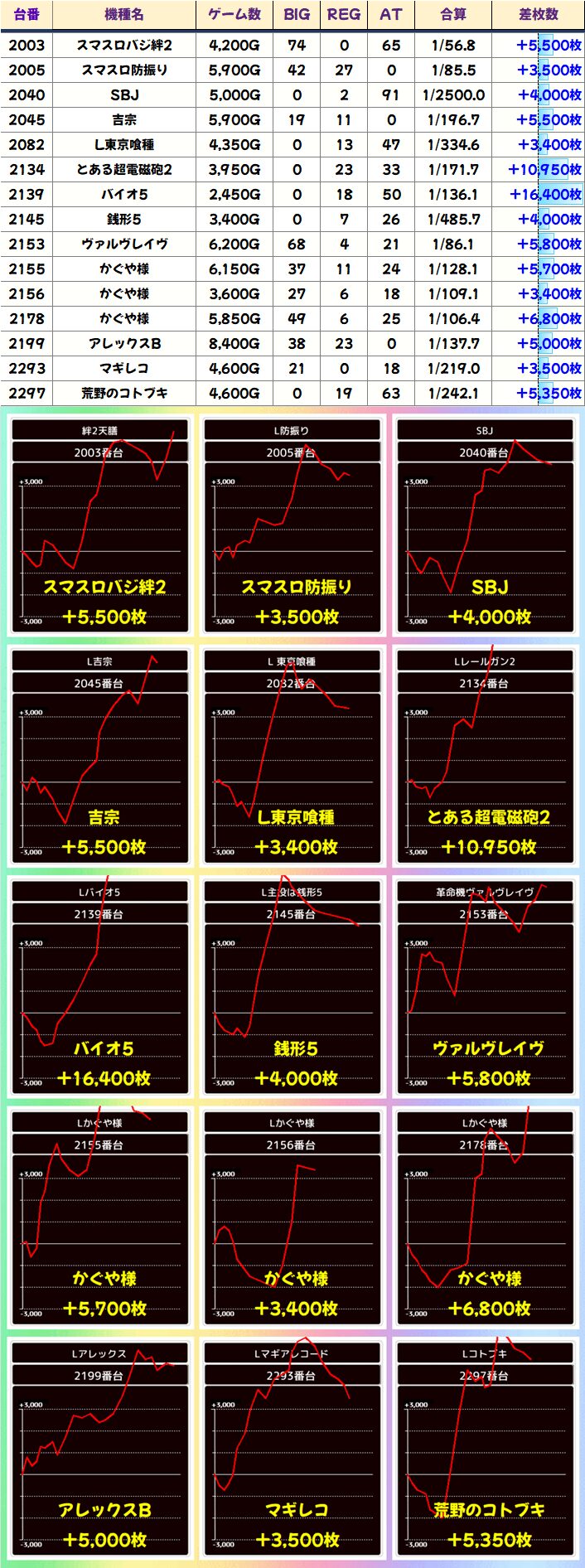 全系機種が塊っているエリアもあり、上記15台は烈前仕掛けで優秀台が連続していました。