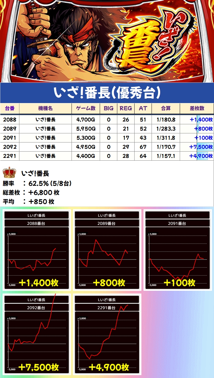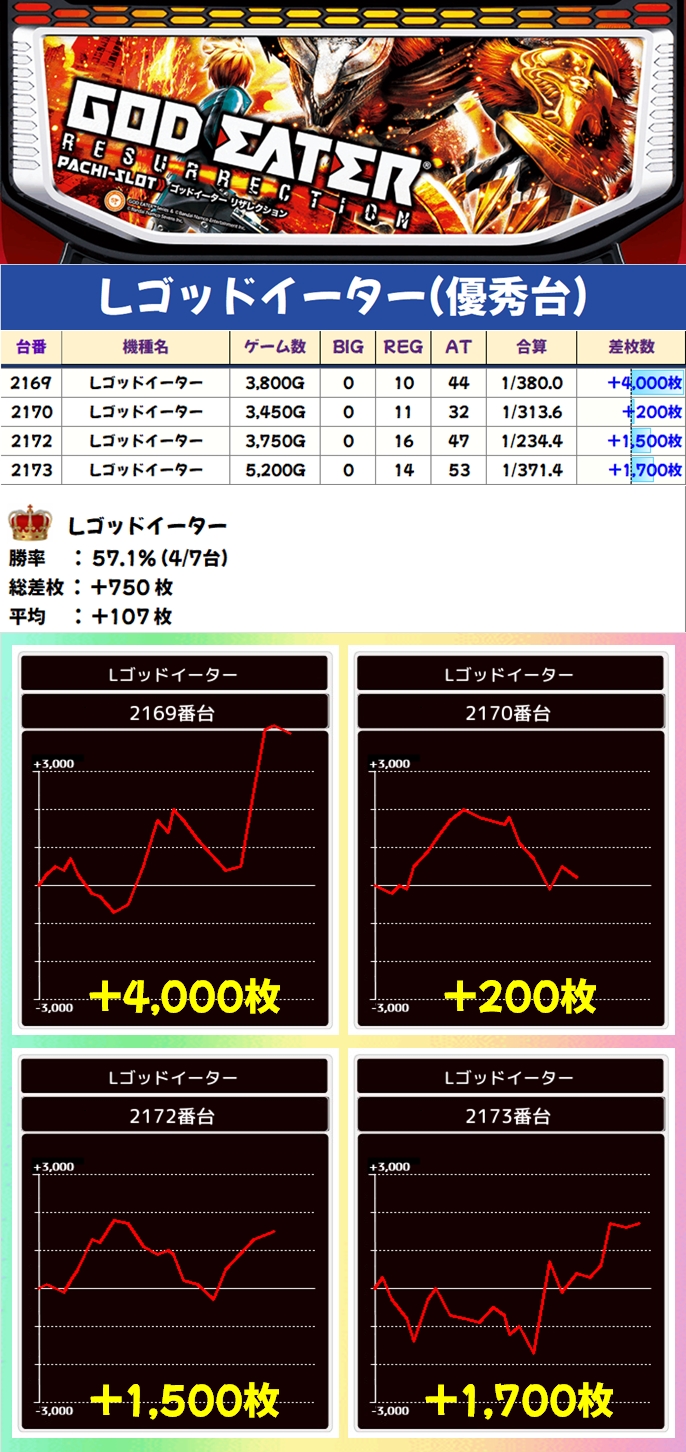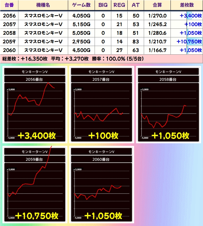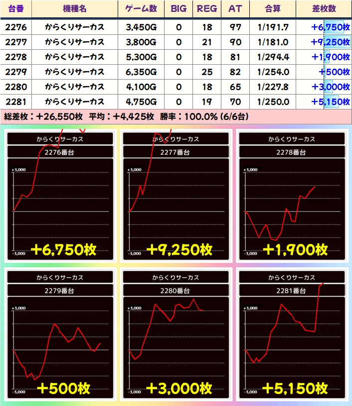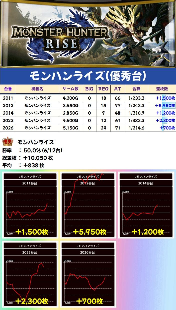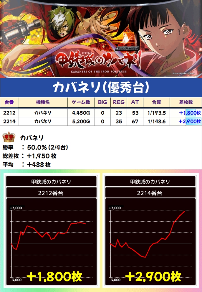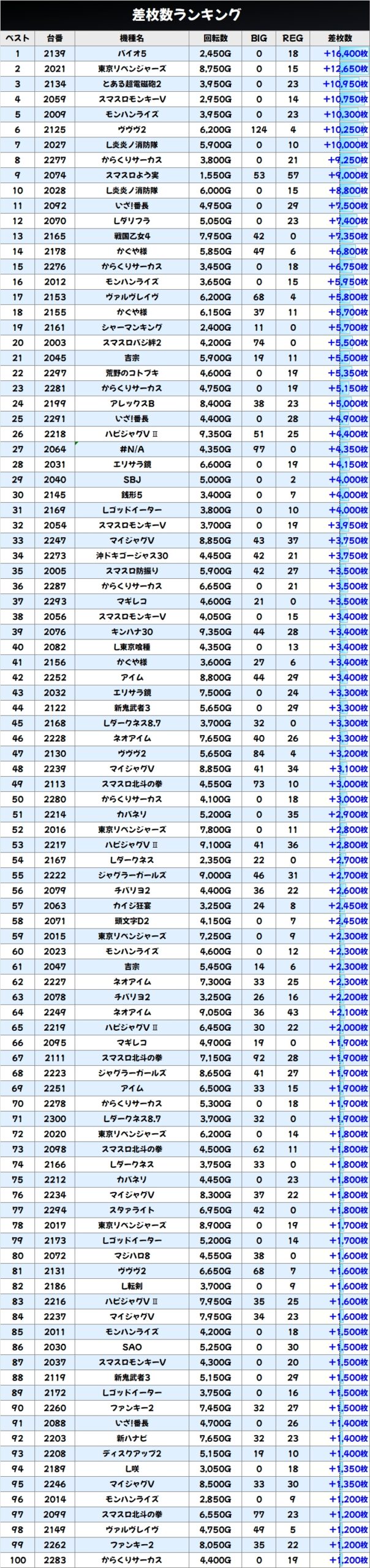 1/2系濃厚の高配分機種も全台系と同じく10機種以上確認!昔からの根強い人気の台から最新台まで幅広く仕掛けられました。もちろん、全台系に内容では劣るものの、多くの機種が平均差枚プラスとなりモンキーやからくりからは万枚クラスの台も出現!