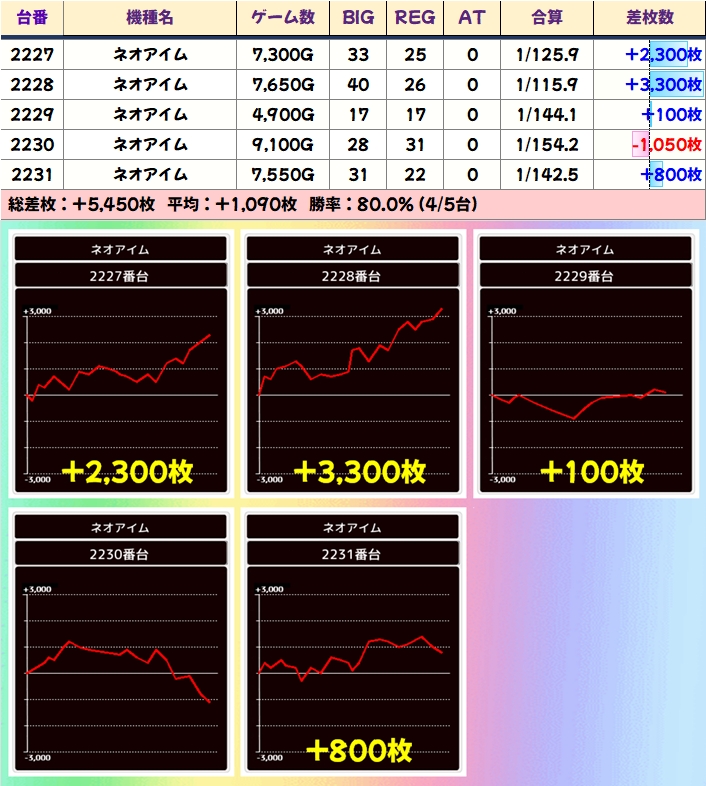 並びは高配分機種以外にも仕掛けられ、機種イチのエリアやジャグはネオアイムなどに優秀台が連続していました。
