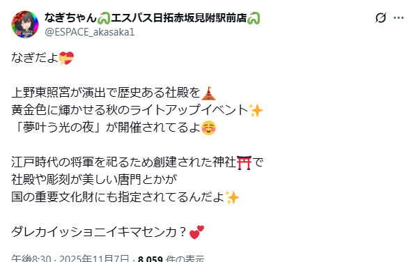 公式Xでは「なぎちゃんの独り言」もしっかり発動。公式Xのお知らせは大体20時に、そこから30分後に独り言がポストされる傾向にあるので、しっかりチェックしておきましょう。