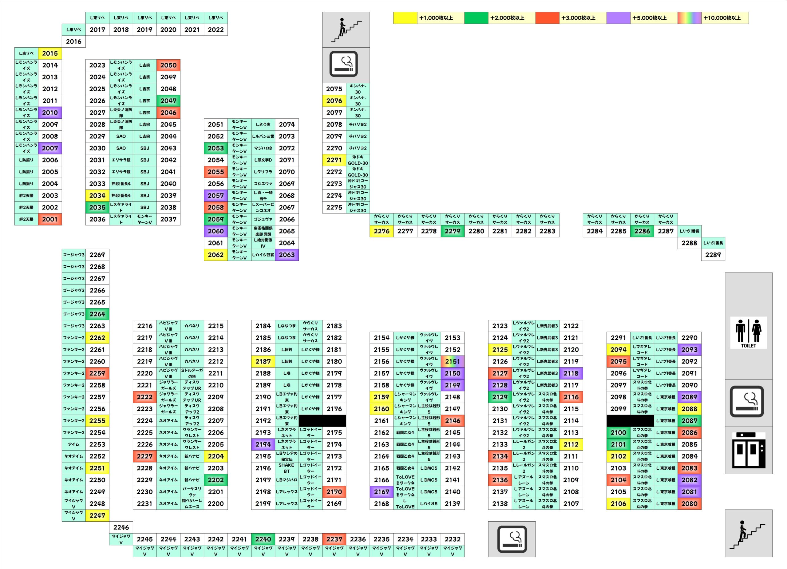 1/2系機種の多くから優秀並びも確認!ほとんどの並びが平均1000枚を超える優秀並びでした!赤坂見附は並びが使われることも多いので、優秀台を見つけたらまずはサイドがねらい目!
