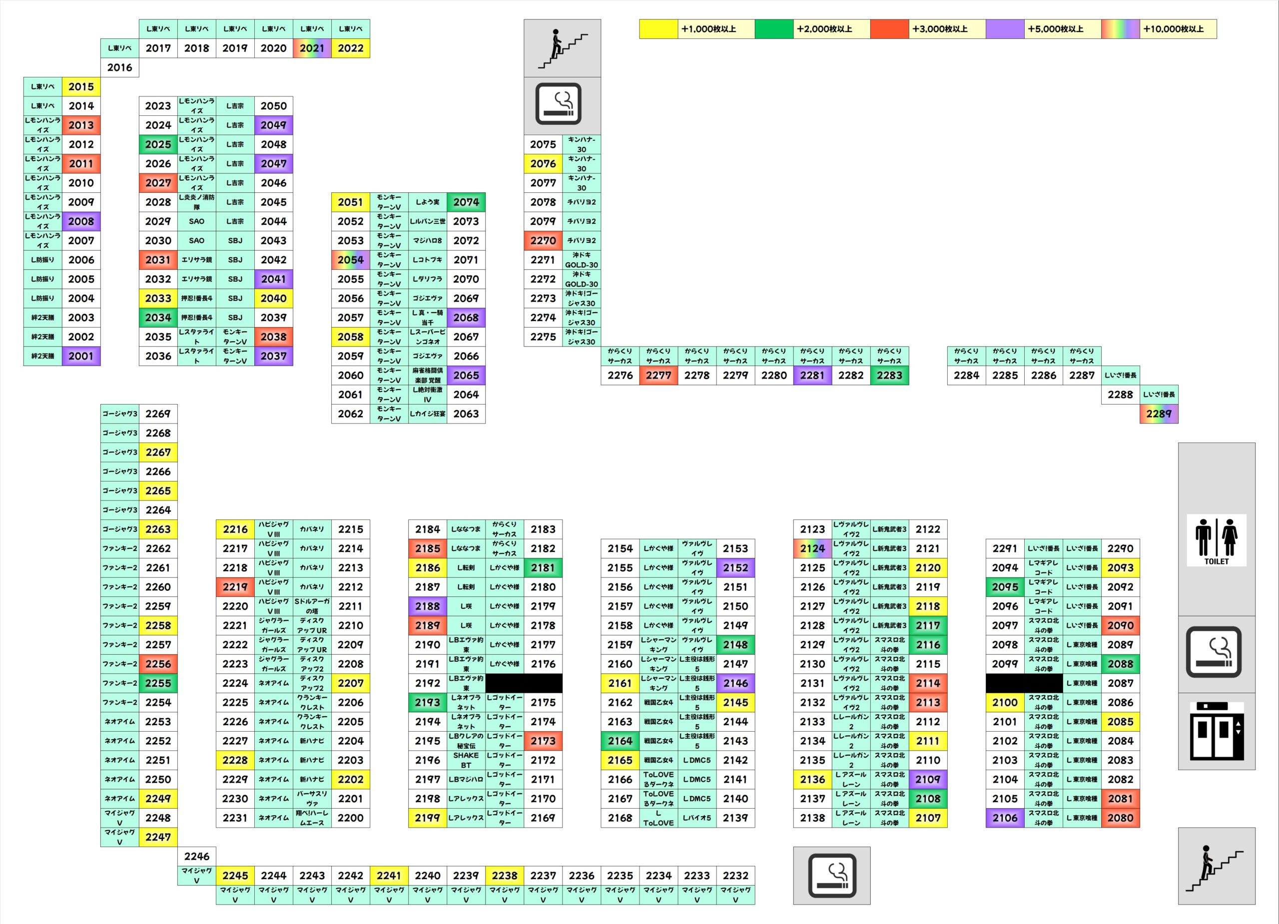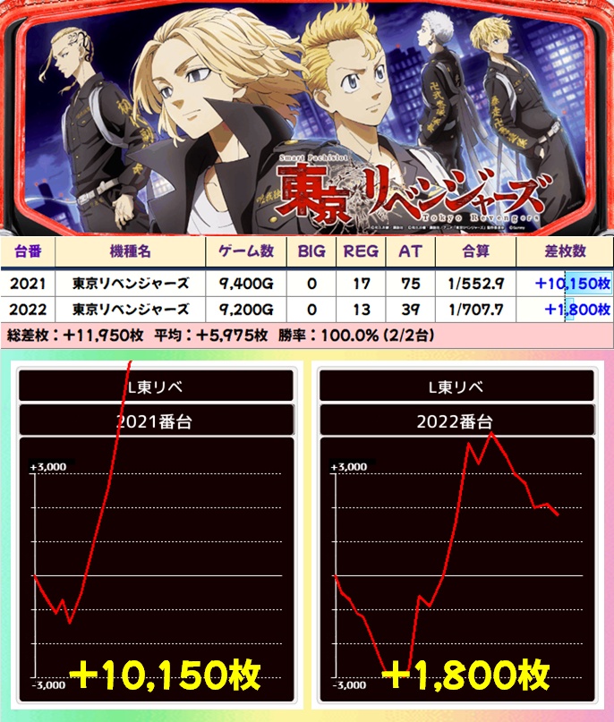 土曜日は並びが強いのが特徴で、東リべや喰種の並びは平均3000枚超!立ち回る際はいかなる場合も並びを意識するとよさそうです