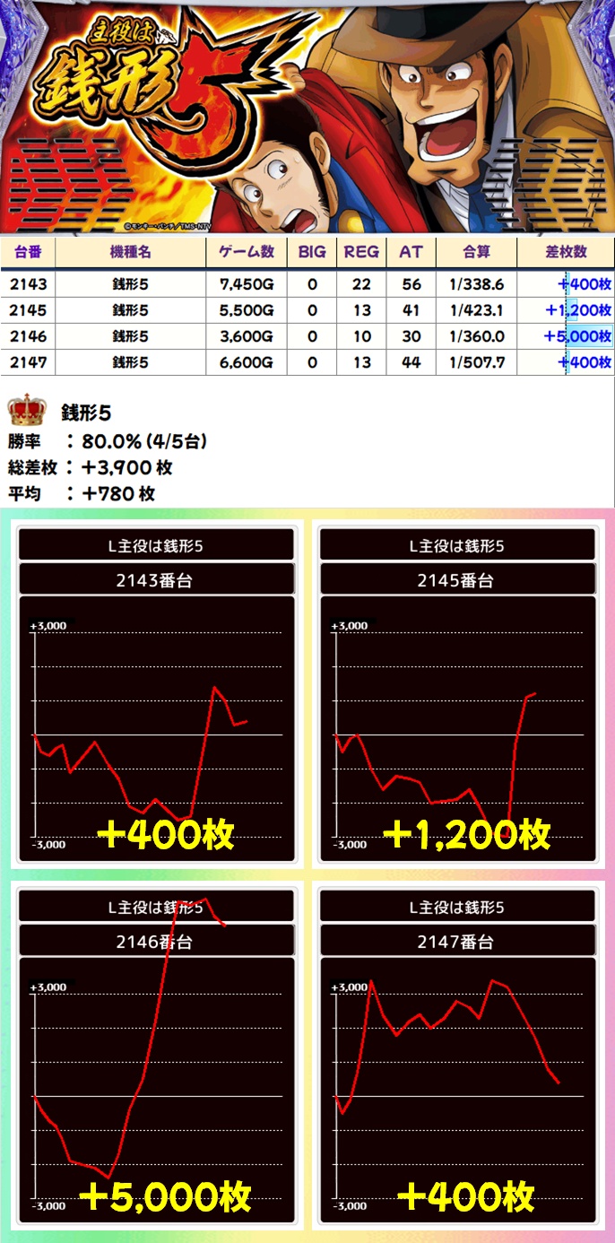 主役は銭形5(4/5台+)➡平均+780枚