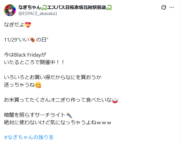 公式Xでは「なぎちゃんの独り言」もしっかり発動。公式Xのお知らせは大体20時に、そこから30分後に独り言がポストされる傾向にあるので、しっかりチェックしておきましょう。