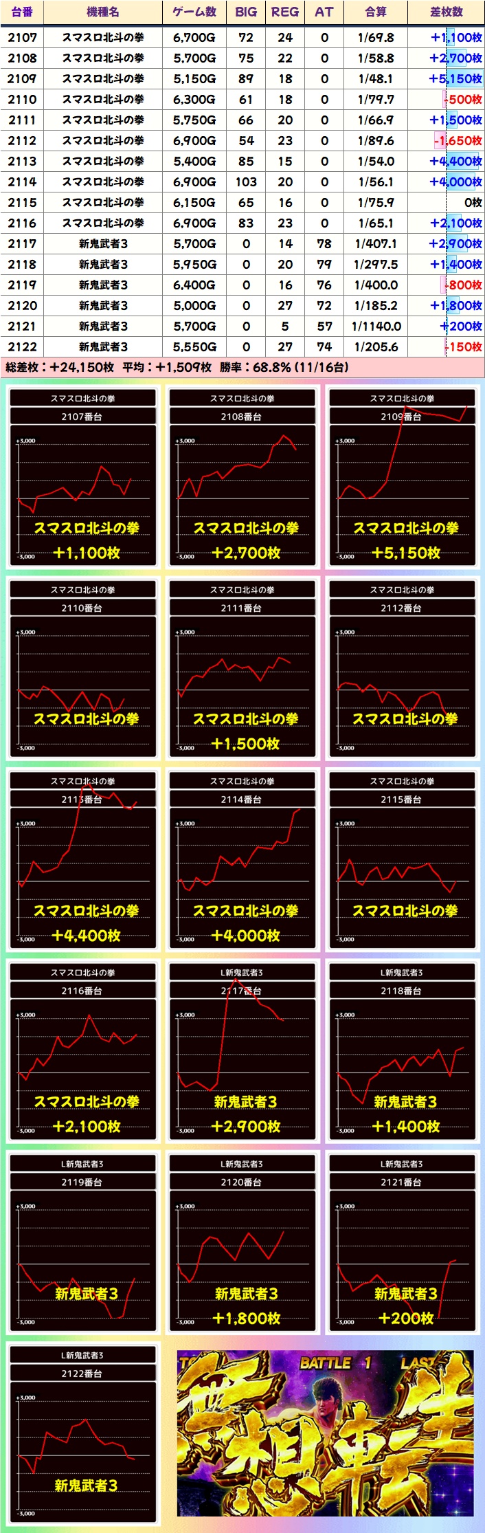 全系の新鬼3が設置のあるシマが列全仕掛けだった可能性あり!大半の台が+1000枚超で稼働も良し!特日は北斗も仕掛けに絡むことが多いので、北斗を攻める際は並びを意識!