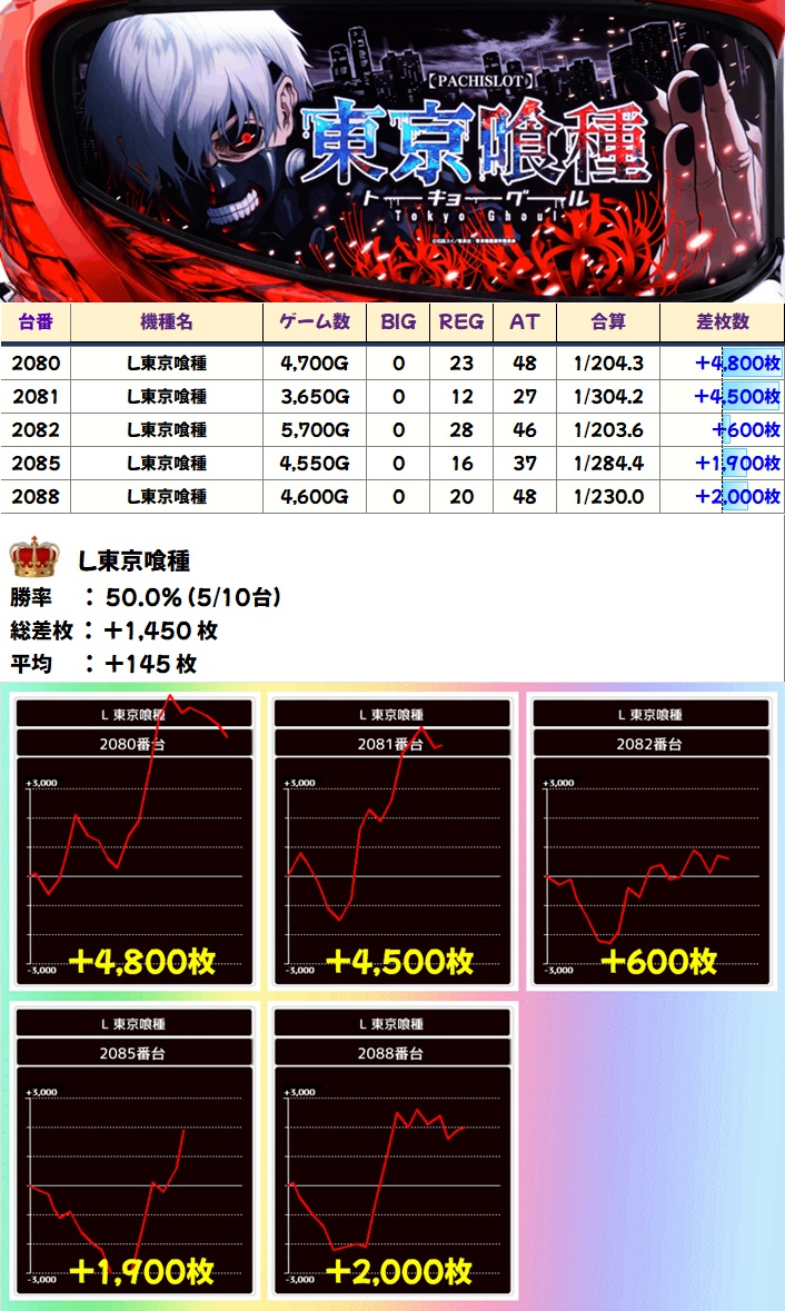 東京喰種(5/10台+)➡平均+145枚