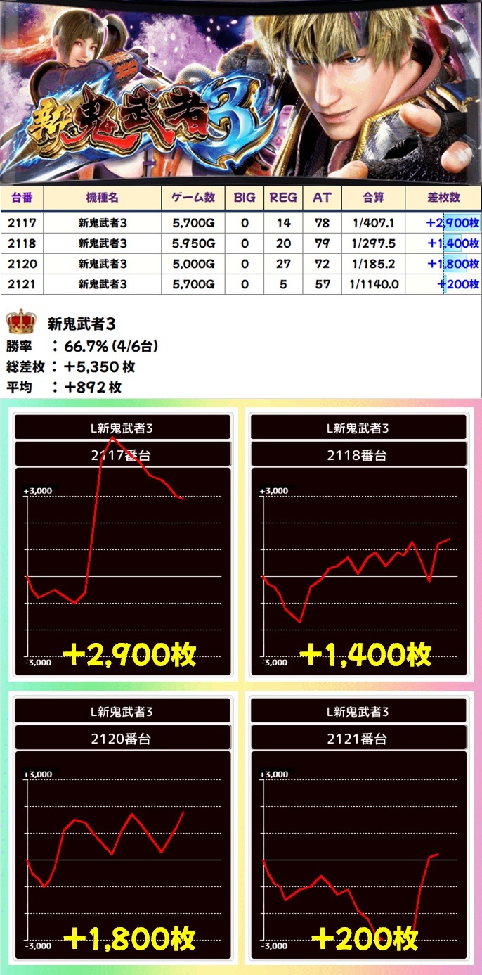 新鬼武者3(4/6台+)➡平均+892枚