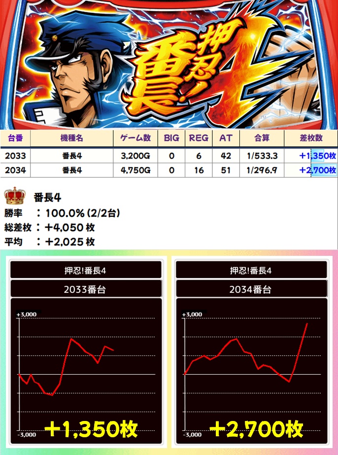 番長4(2/2台+)➡平均+2,025枚