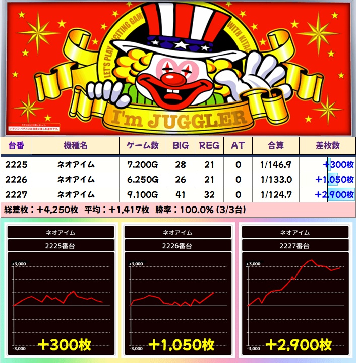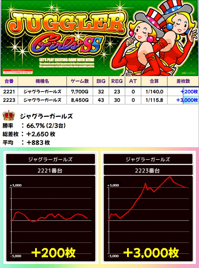 毎回ジャグには仕掛けがあり、今回は独り言機種含め3シリーズが1/2系以上でした。結果はもちろん、勝率も50%オーバーと優秀でした!