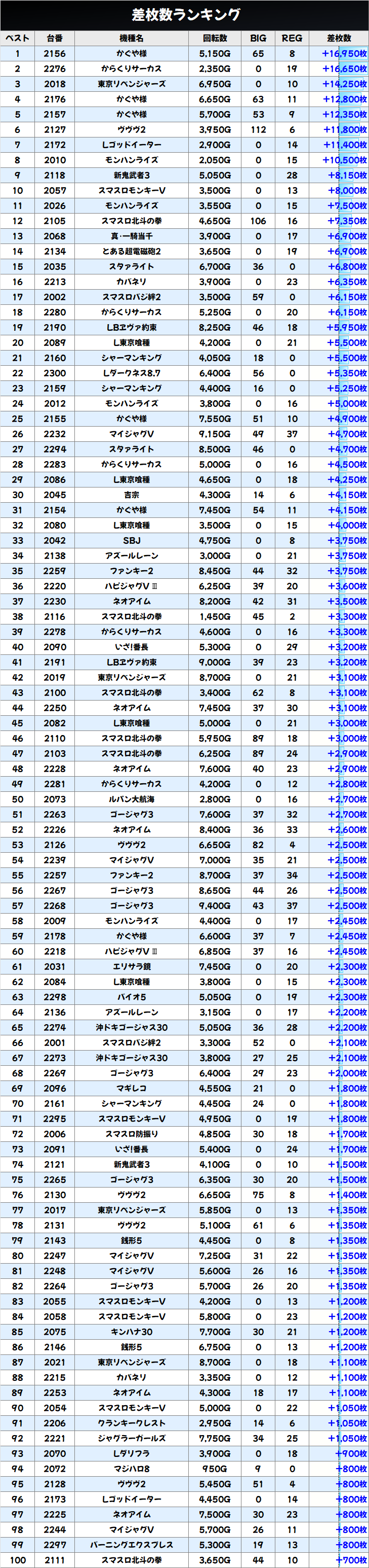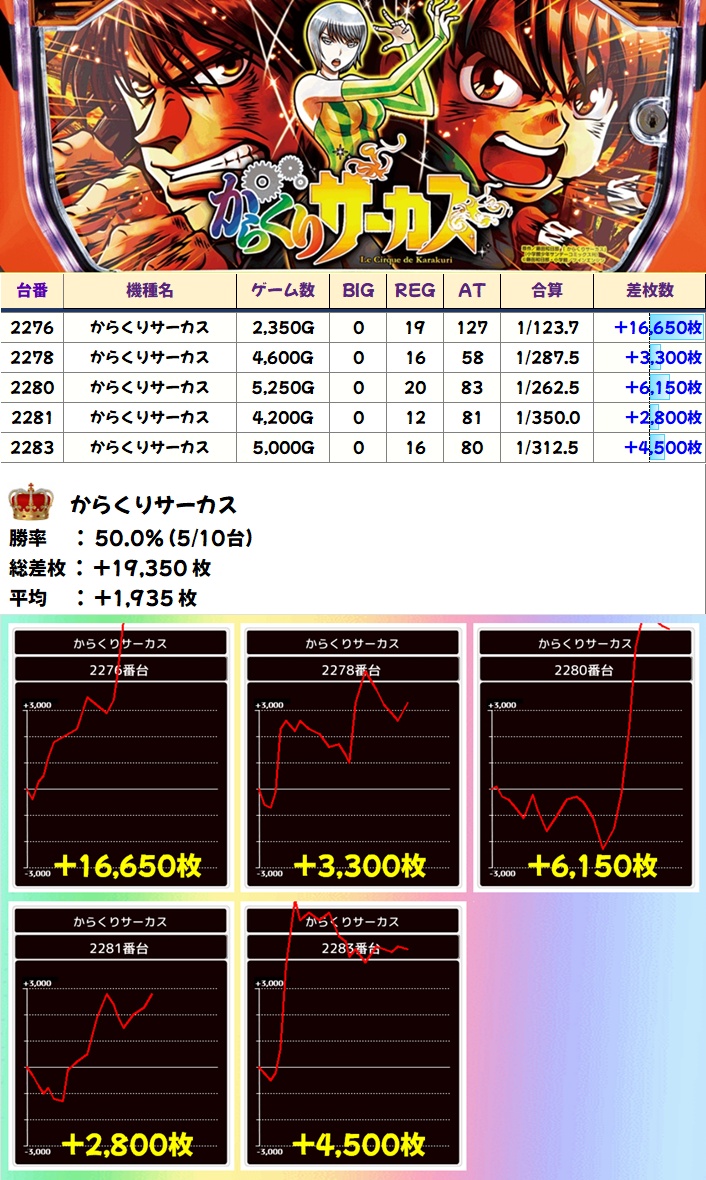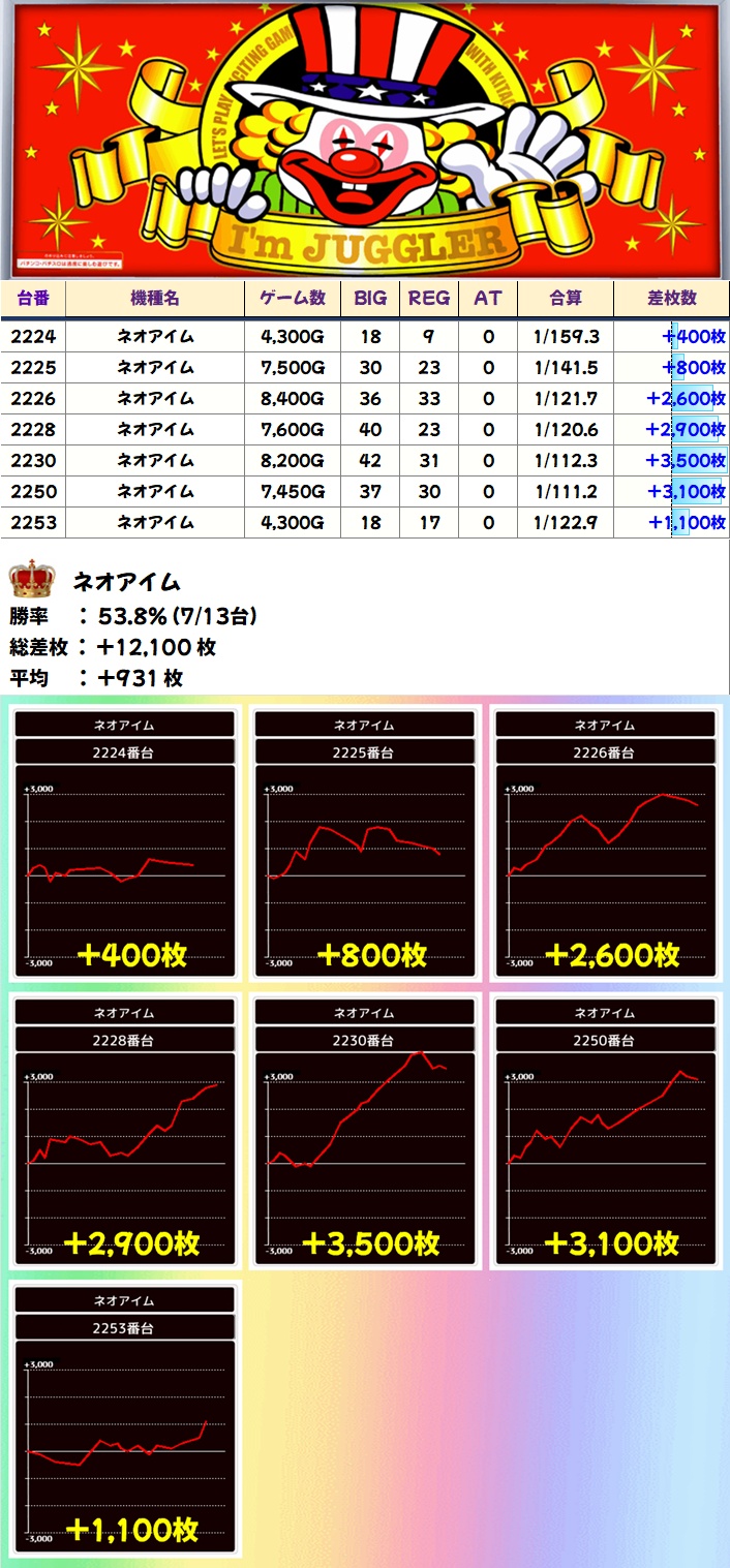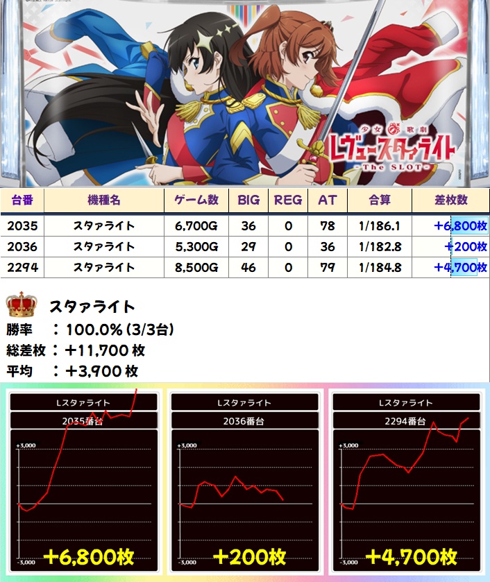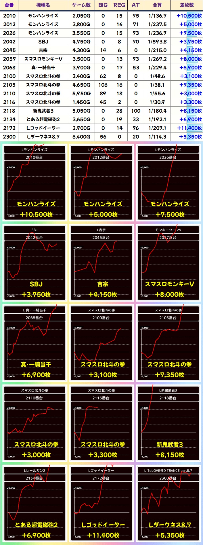 今回は5機種が全系濃厚で全機種平均1000枚超と優秀!マンキンやスタァライトなどAT機は平均約4000枚にも上り、5000枚クラスも複数確認できました!
