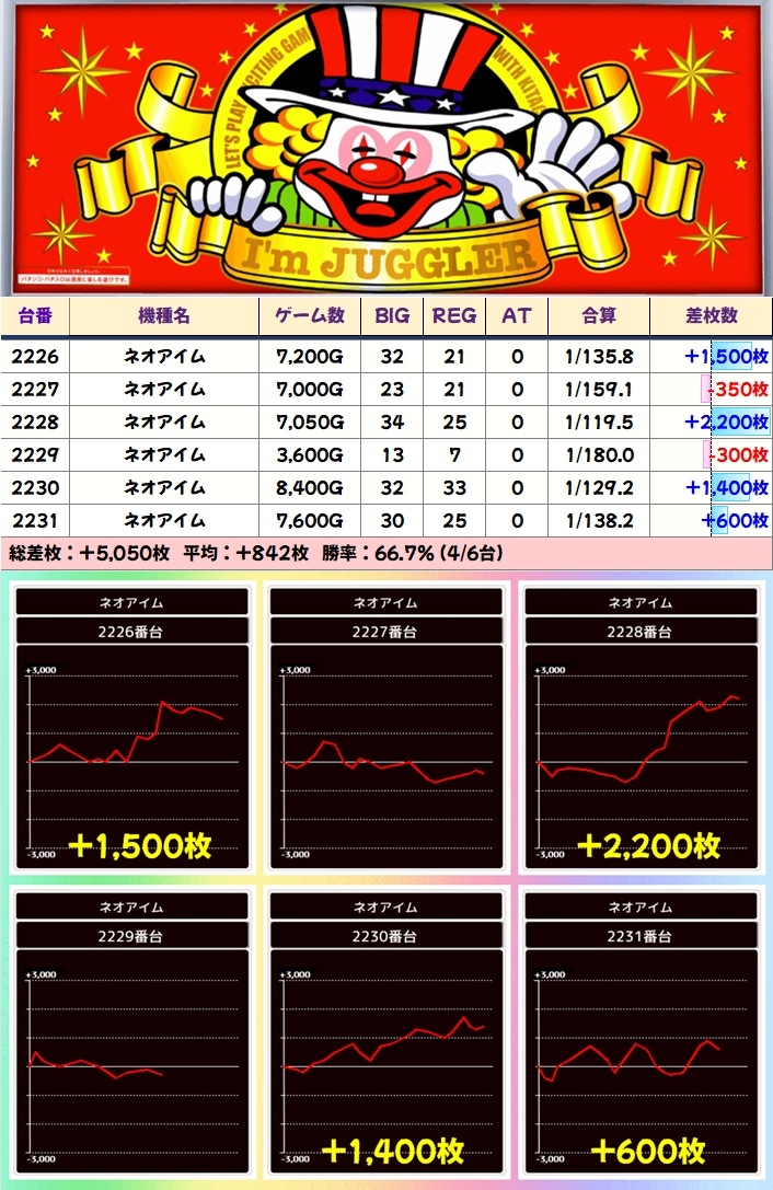 優秀並びは複数あり、多くの並びが平均2000枚超!高配分仕掛けには絡んでいないネオアイムやマイジャグなどからも並び仕掛けが出現し、しっかりと結果を残しました!