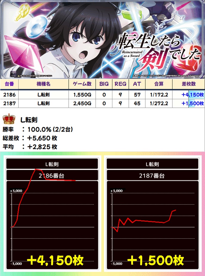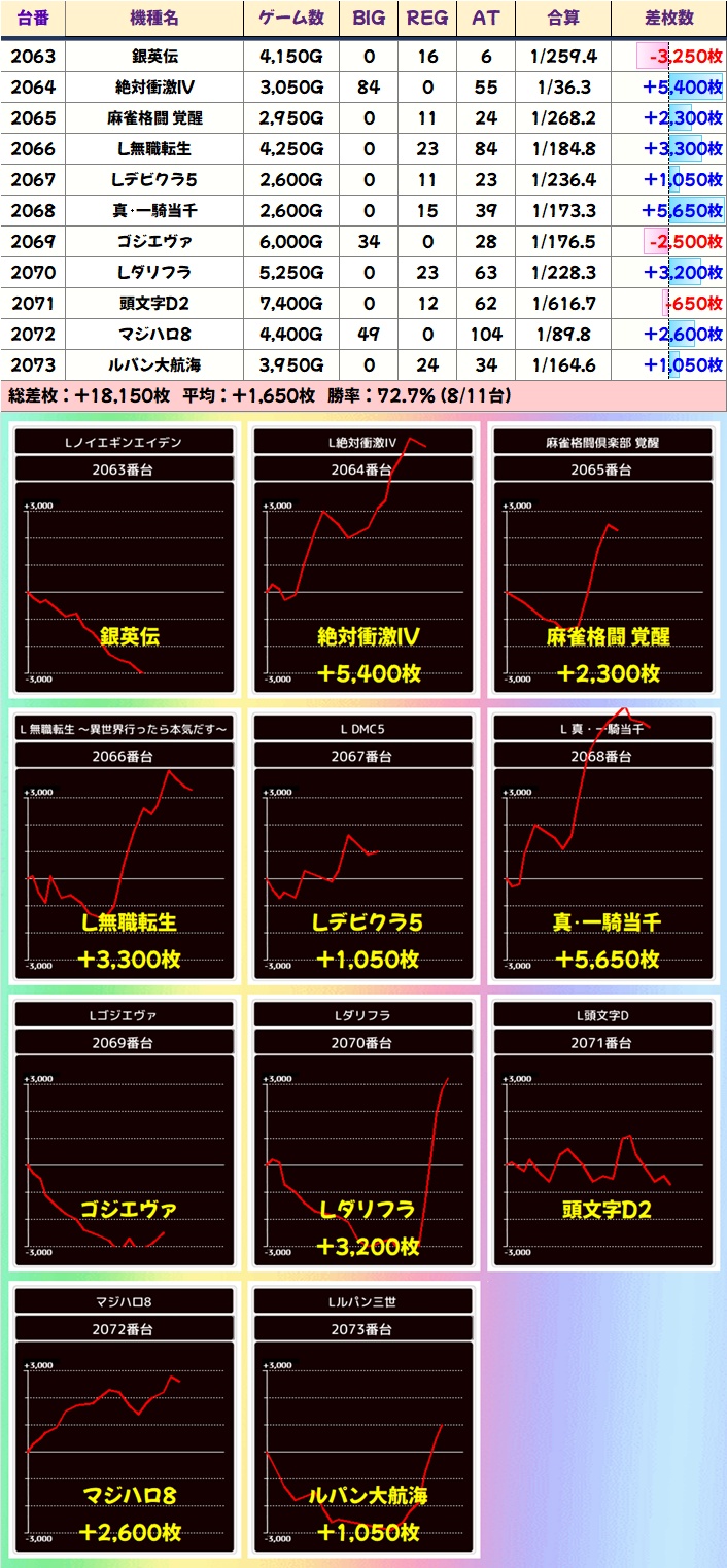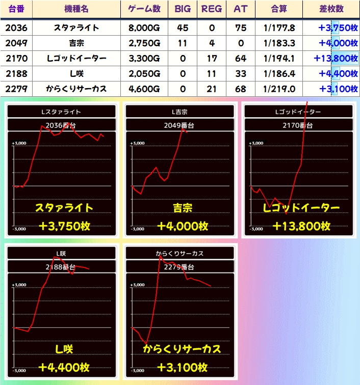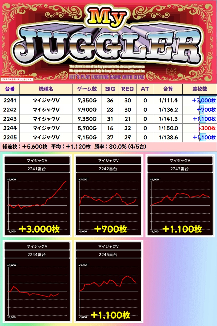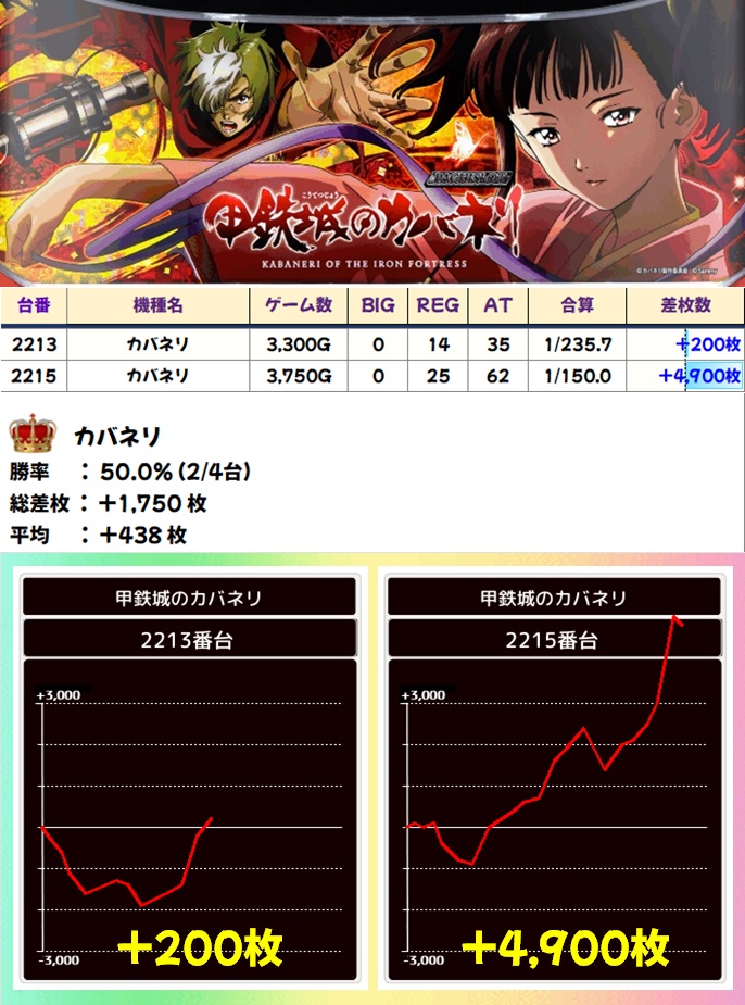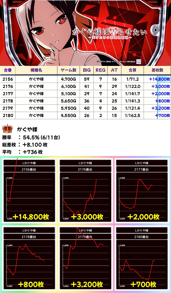 ほぼ全機種から5000枚超台が確認でき、ヴヴヴ2やかぐや様からは万枚台も出現しました!