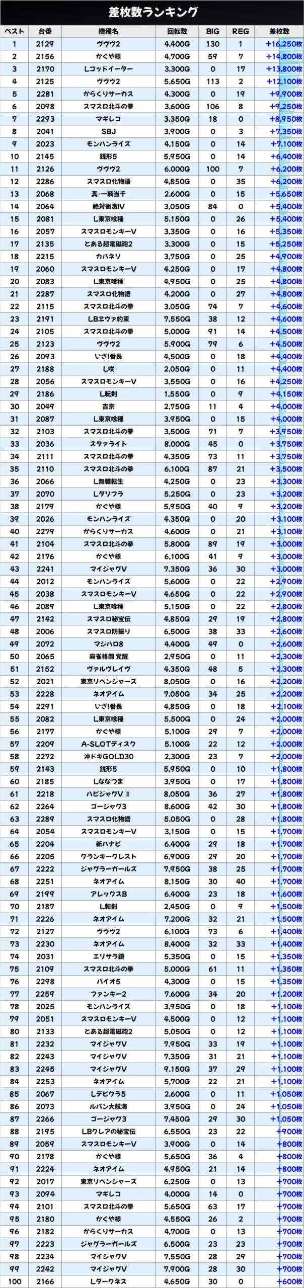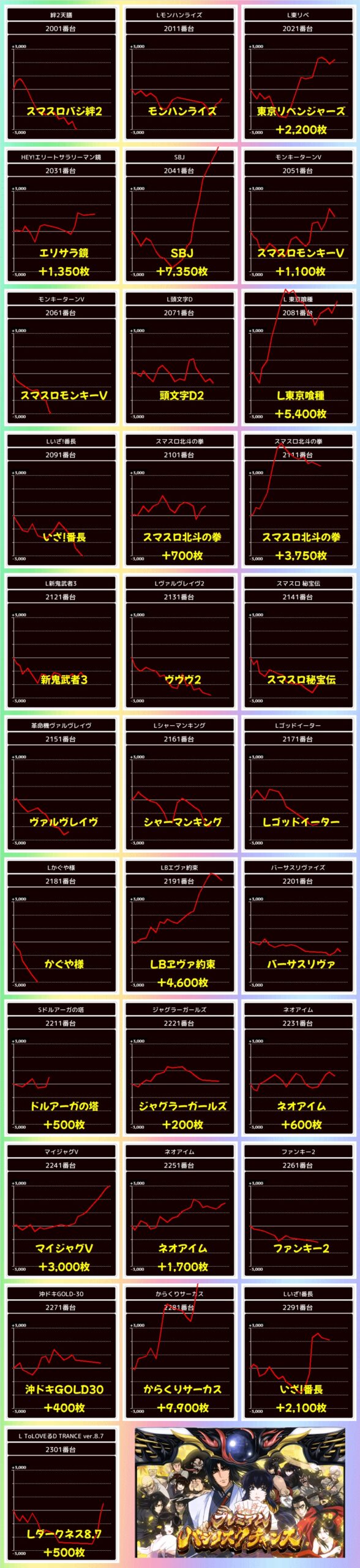 高配分機種は10機種もあり、主に人気機種を中心に仕掛けられました。また、ジャグやバラエティにも高配分仕掛けだったので番号が悪かった=あたりにたどり着けないということもなかったでしょう。