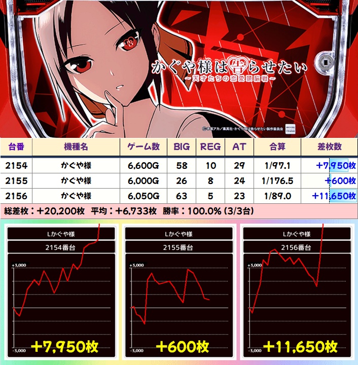 高配分絡みや人気スマスロにも並びあり!高配分に絡んでいないかぐや様からは万枚台も出現と並びはかなり力が入っていたように感じます!