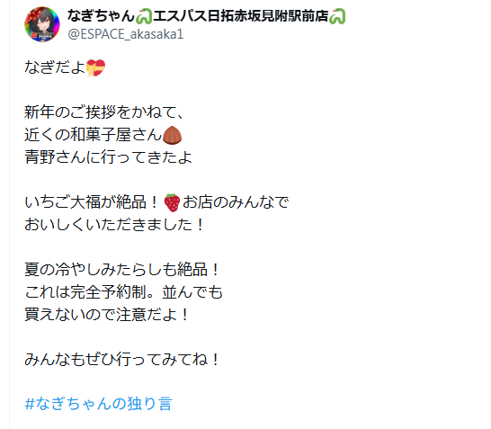 公式Xでは「なぎちゃんの独り言」もしっかり発動。公式Xのお知らせは大体20時に、そこから30分後に独り言がポストされる傾向にあるので、しっかりチェックしておきましょう。