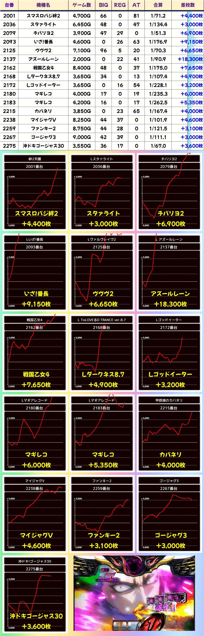 単品3000枚超台も多数あり!仕掛け外からもアズレンやいざ番など万枚クラスの台も複数ありました!ジャグや新台系も優秀!
