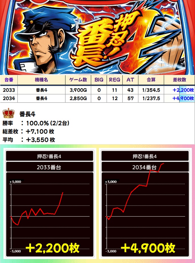 番長4(2/2台+)➡平均+3,550枚