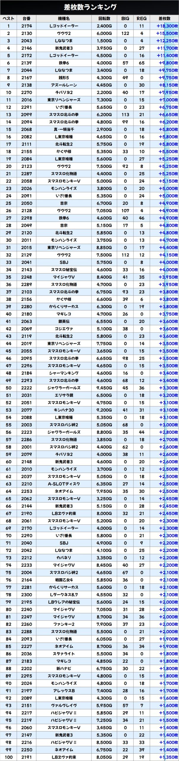 人気スマスロやノーマルにも高配分以上機種確認!10機種以上の高配分機種すべてがプラス差枚でした!