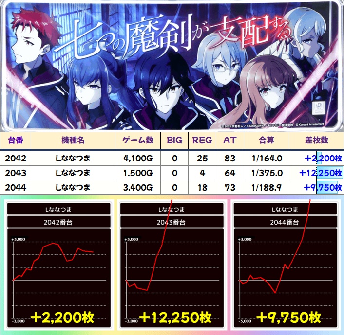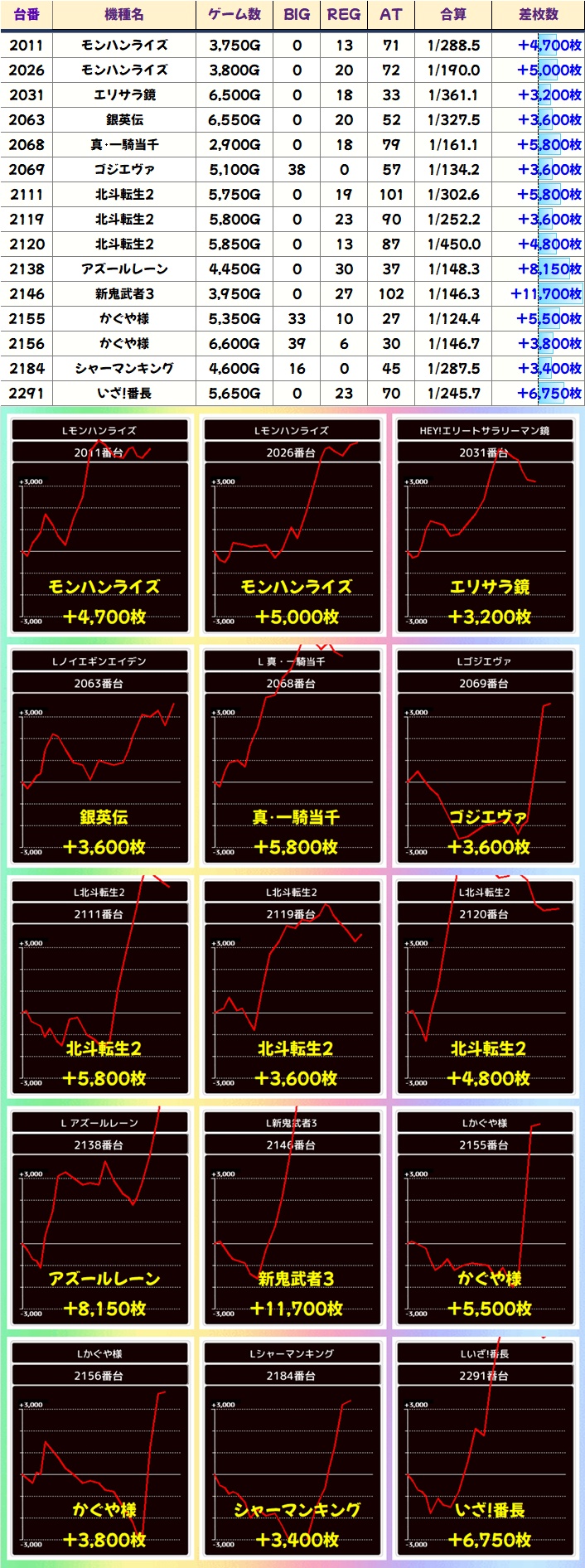 全台系濃厚機種は4機種あり、スマスロだけでなくノーマルも2機種もあるので番号が悪くてもチャンスはあった模様。ななつまは万枚クラスが2台ととびぬけて優秀なので、全系の中でもかなり高品質台だった可能性あり!?
