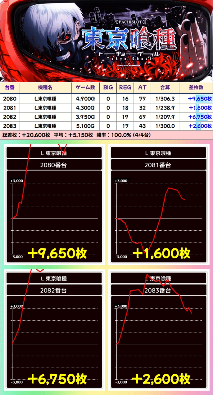 【4台並び】東京喰種(2080-2083番台)→平均+5150枚