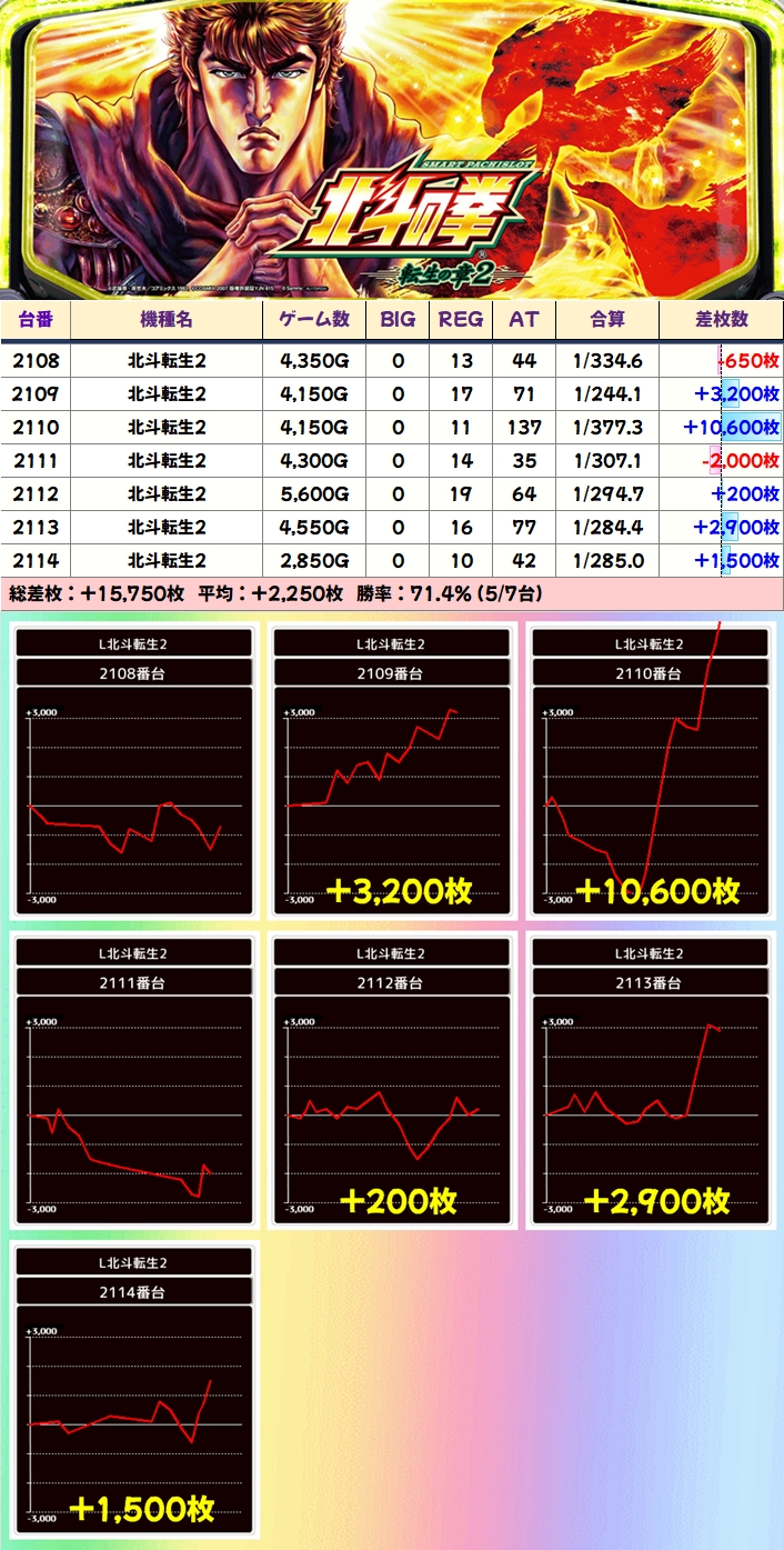 【7台並び】北斗転生2(2108-2114番台)→平均+2250枚