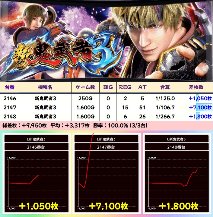 【3台並び】新鬼武者3(2146-2148番台)→平均+3317枚