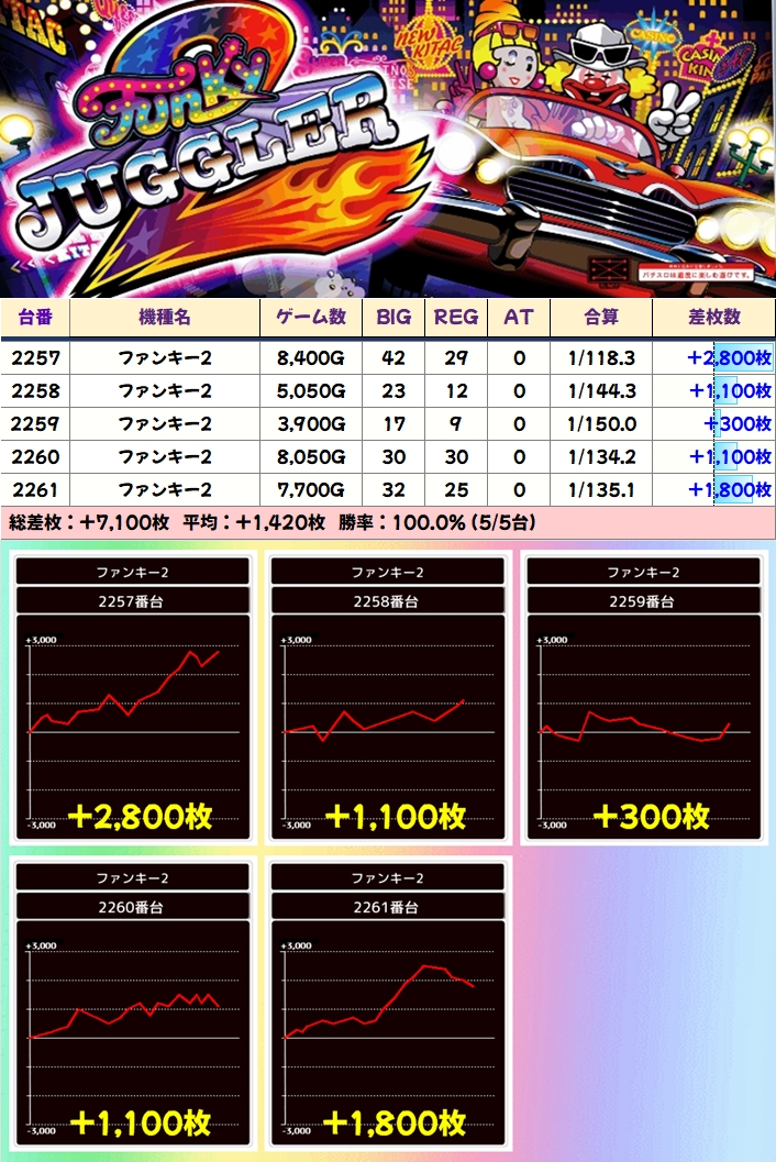 【5台並び】ファンキー2(2257-2261番台)→平均+1420枚