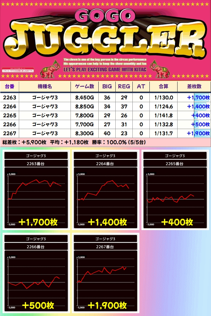 【5台並び】ゴージャグ3(2263-2267番台)→平均+1180枚