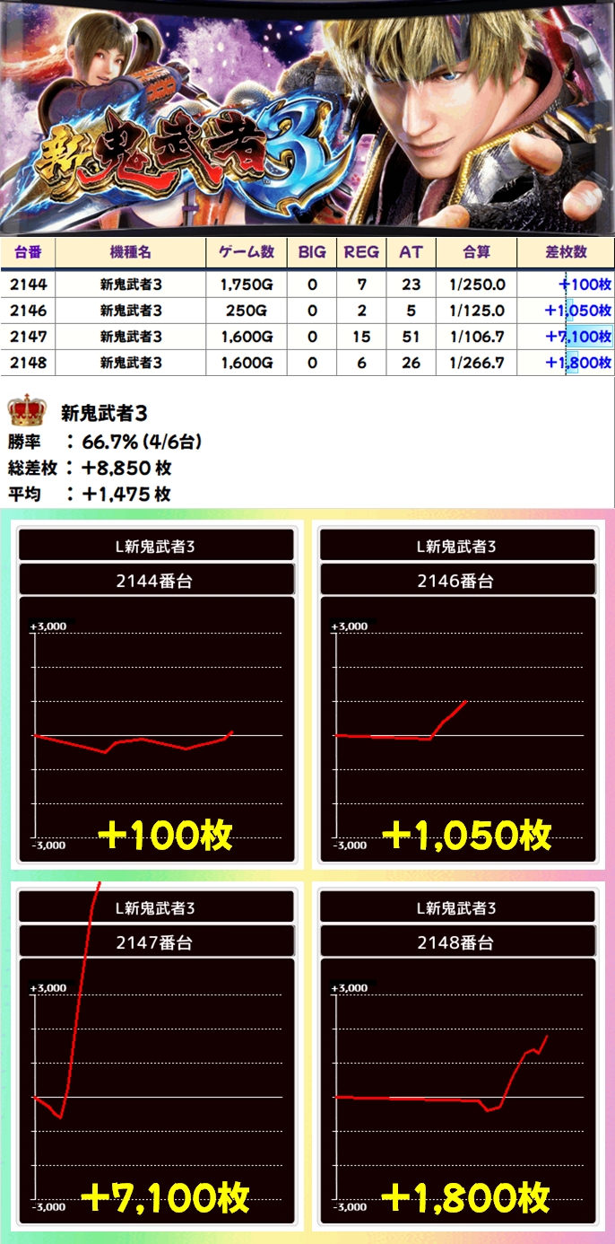 新鬼武者3(4/6台+)➡平均+1475枚