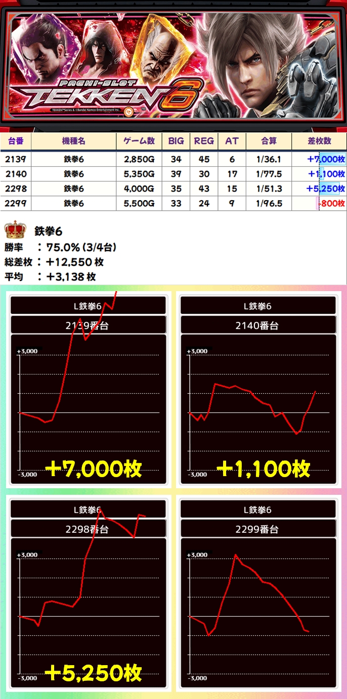 鉄拳6(3/4台+)➡平均+3138枚