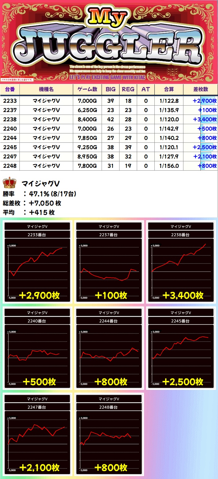 マイジャグV(8/17台+)➡平均+415枚
