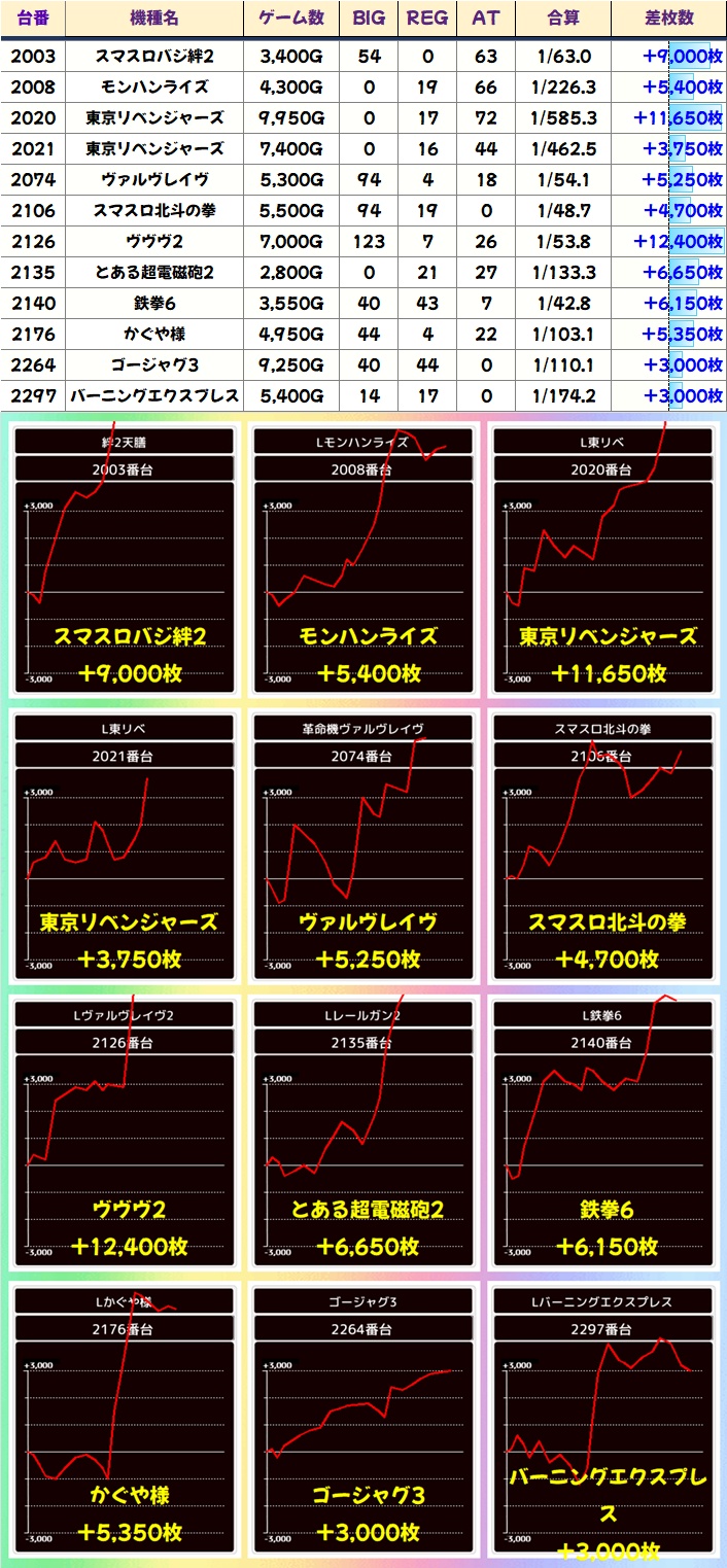 単品優秀台も複数あり!東リべやヴヴヴ2からは万枚超も飛び出し、人気機種からは5000枚超台も数多く出現!