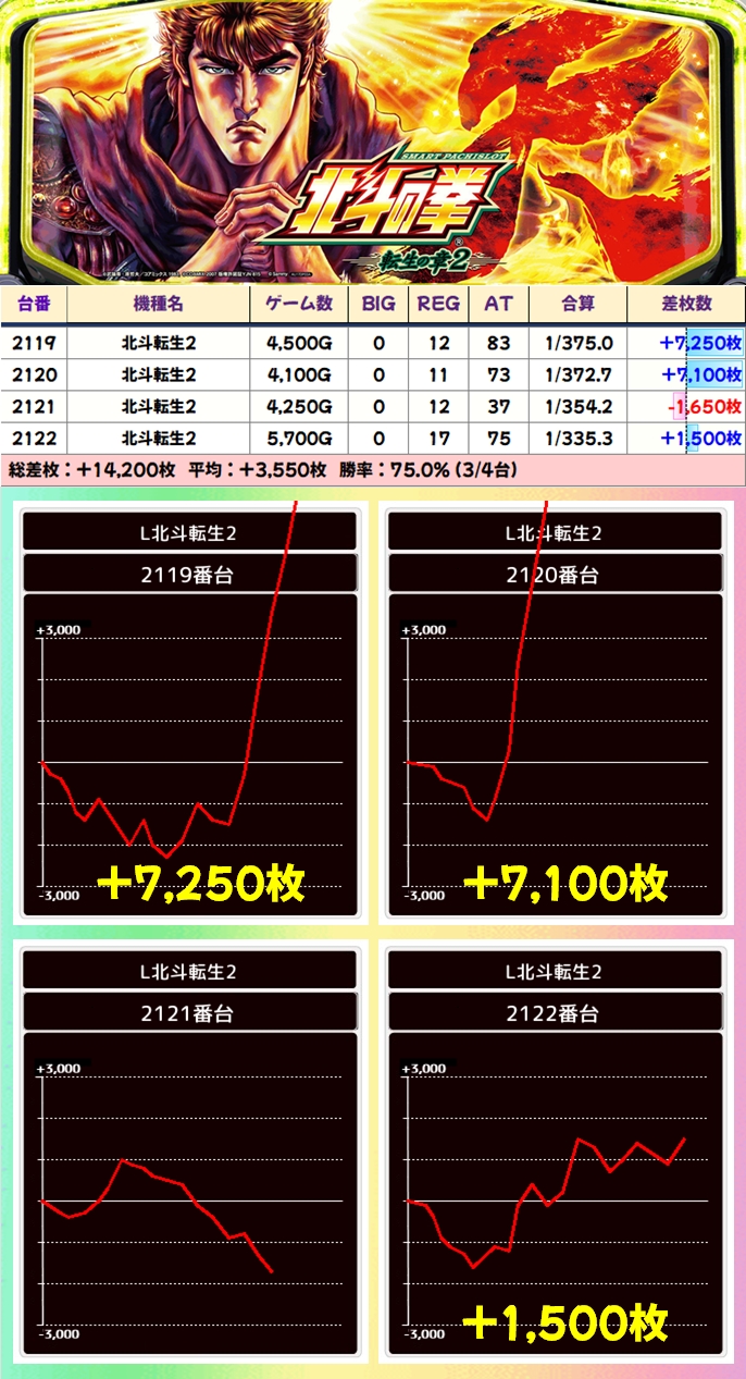 【4台並び】北斗転生2(2119-2122番台)→平均+3550枚