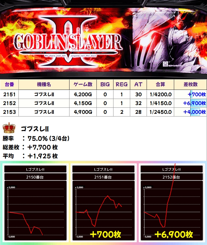 ゴブスレ2(3/4台+)➡平均+1925枚