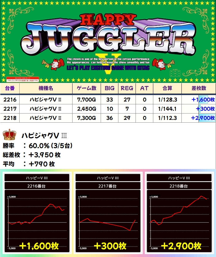 【3台並び】ハピジャグ(2216-2218番台)→平均+1600枚
