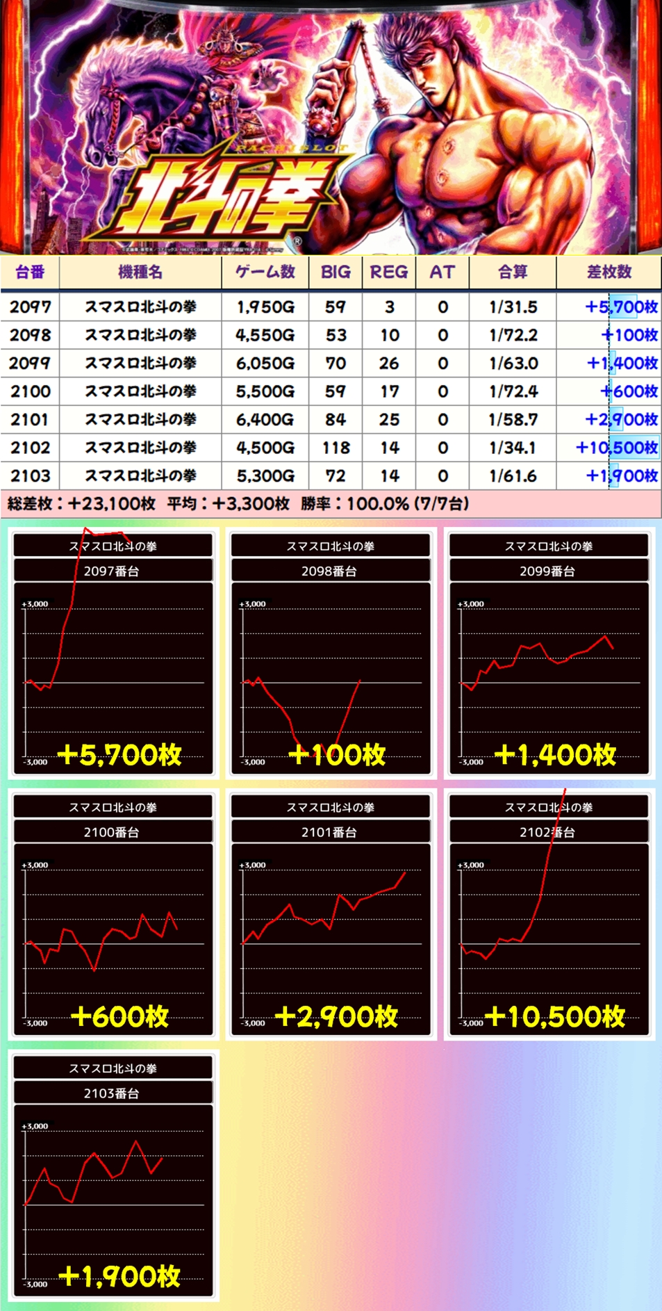 前日の7の日から2連続で高配分の北斗!過去にも仕掛けが数多く確認できたので、やはり北斗は優先度高めで狙いたい。万枚超や5000枚超など内容も良い台が多かったのは間違いないでしょう!