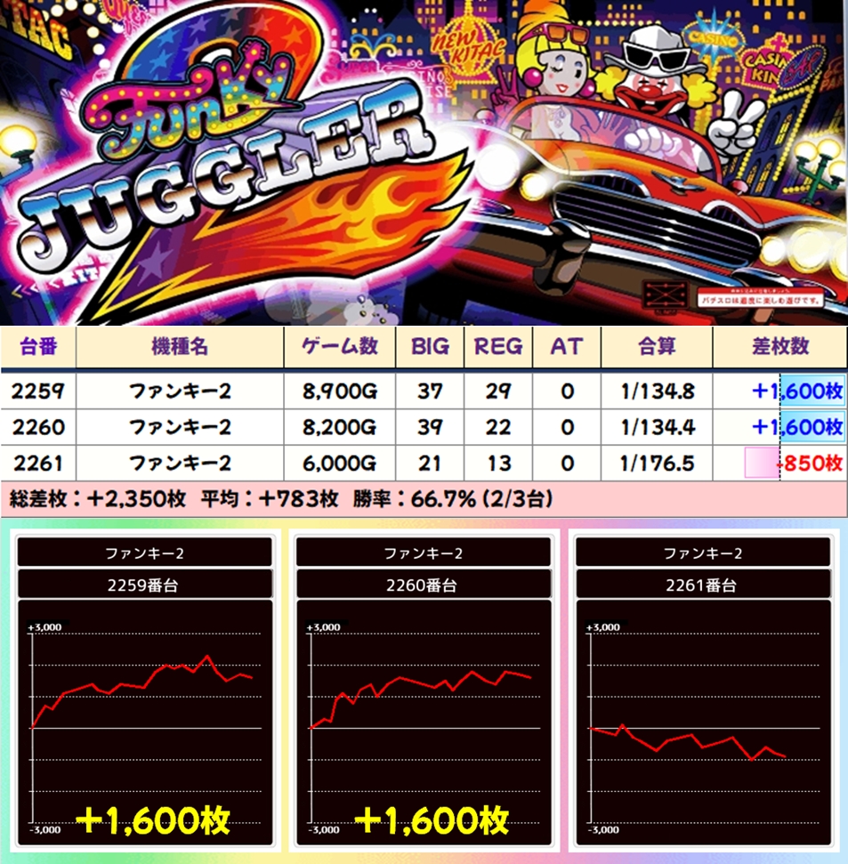 ジャグにも高配分シリーズがあり、今回はファンキー2が優秀に!ジャグも仕掛けに絡むことが多いので番号が悪かった際や1日まったりと遊びたい人にはオススメ!