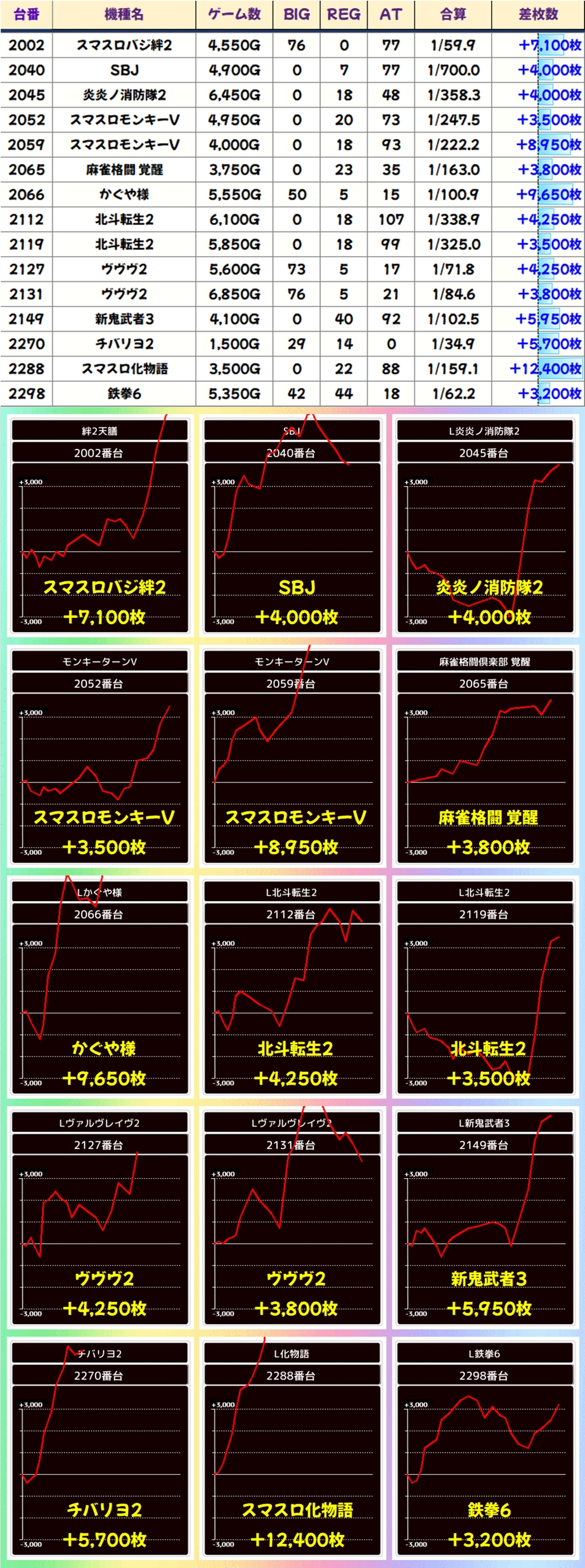 1/2系は全系とは逆におなじみの人気スマスロが優秀に!かぐや様やマギレコは万枚クラスを叩き出し、台平均もプラスの機種が多く好成績でした!