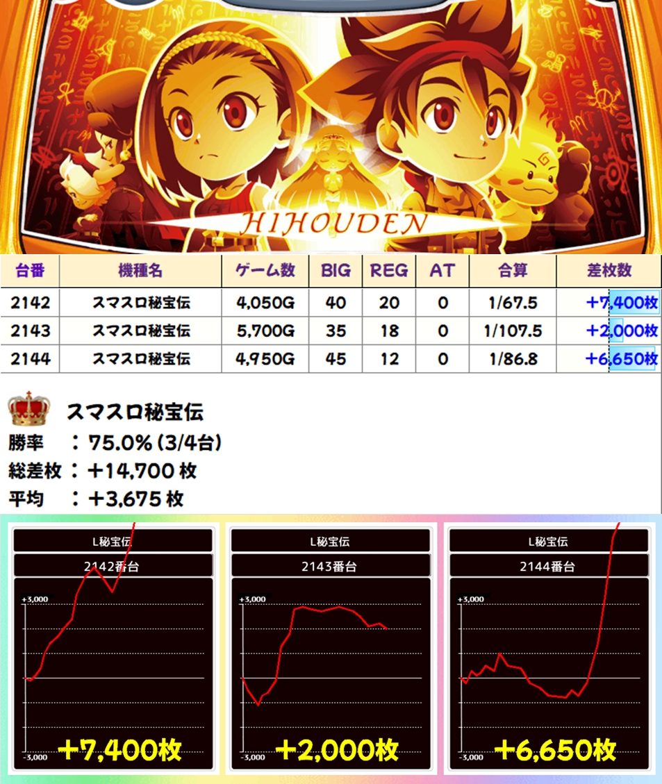 スマスロ秘宝伝(3/4台+)➡平均+3,675枚