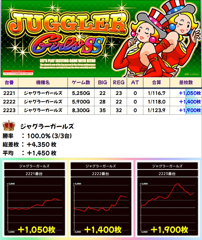 ジャグラーガールズ(3/3台+)➡平均+1450枚