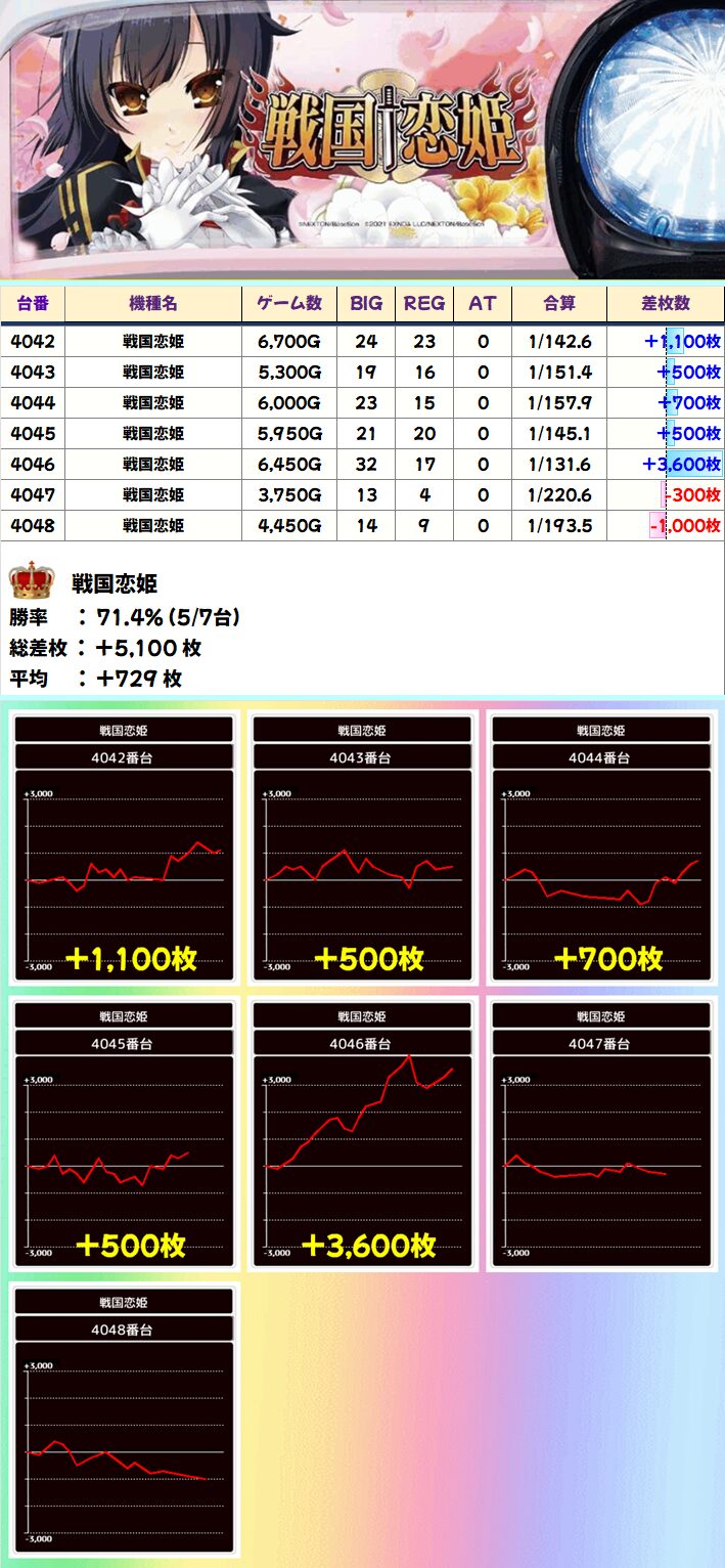 戦国恋姫(5/7台+)➡平均+657枚