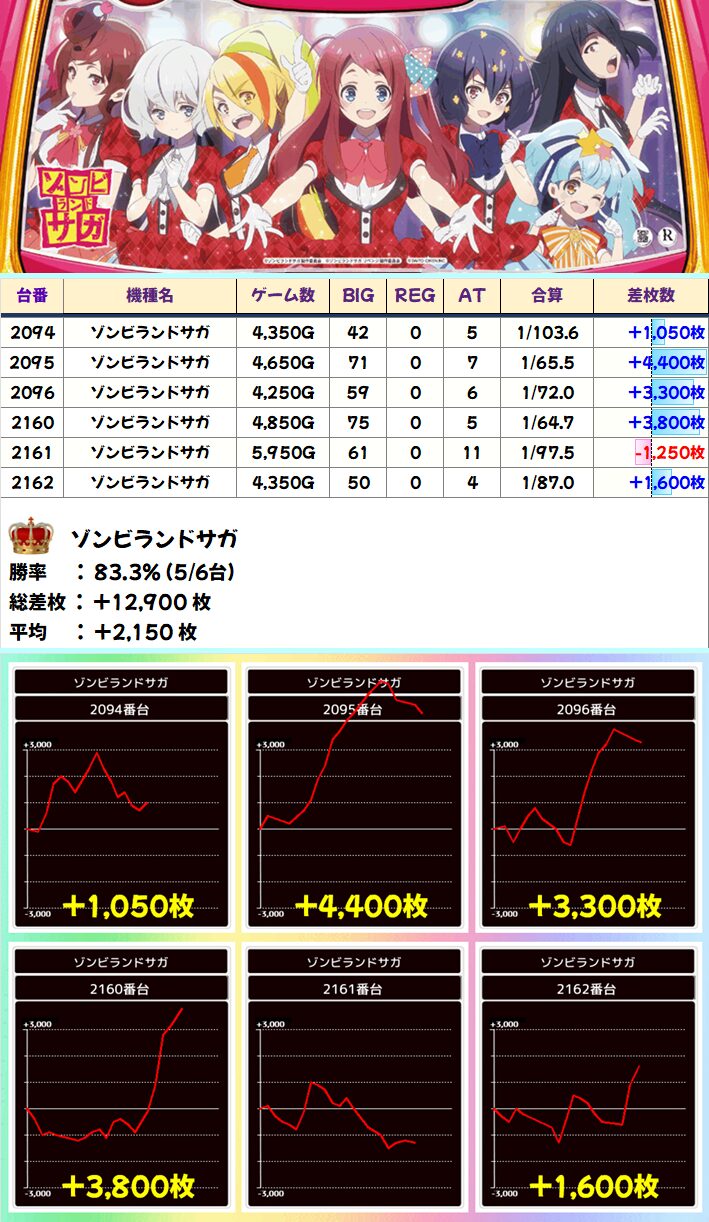 ゾンビランドサガ(5/6台+)➡平均+2,150枚