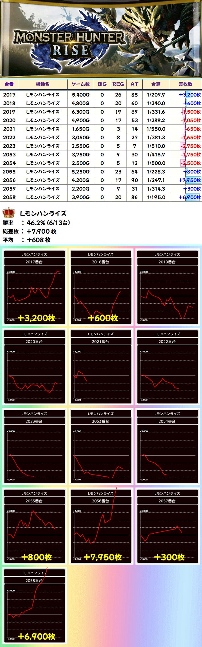 Lモンハンライズ(6/13台+)➡平均+700枚