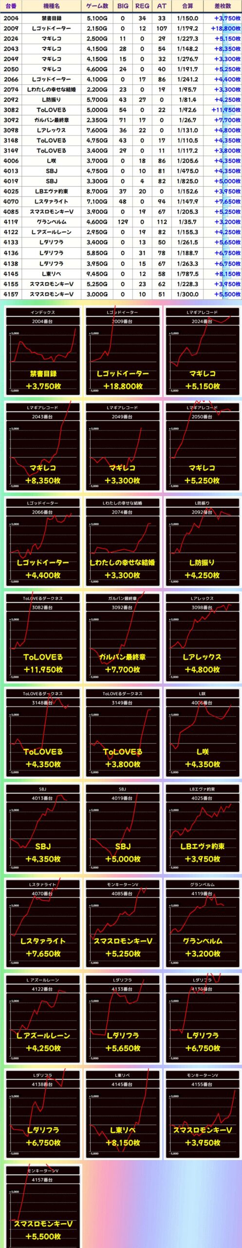 ジャンプオマージュイベということでジャンプ機種に優秀機種多数!とくに北斗は全台系濃厚な結果に!さらにToLoveるはキャラ誕機種ということもあり、好成績を残しました。