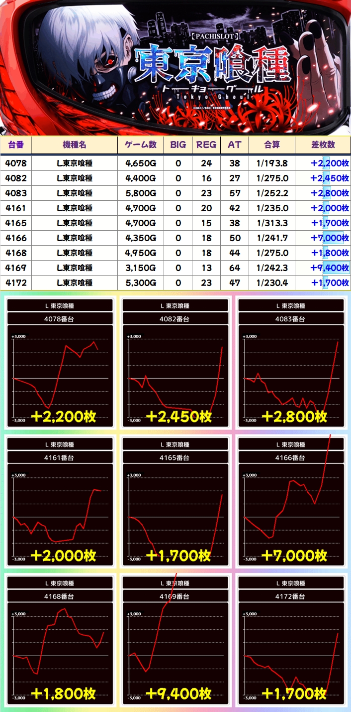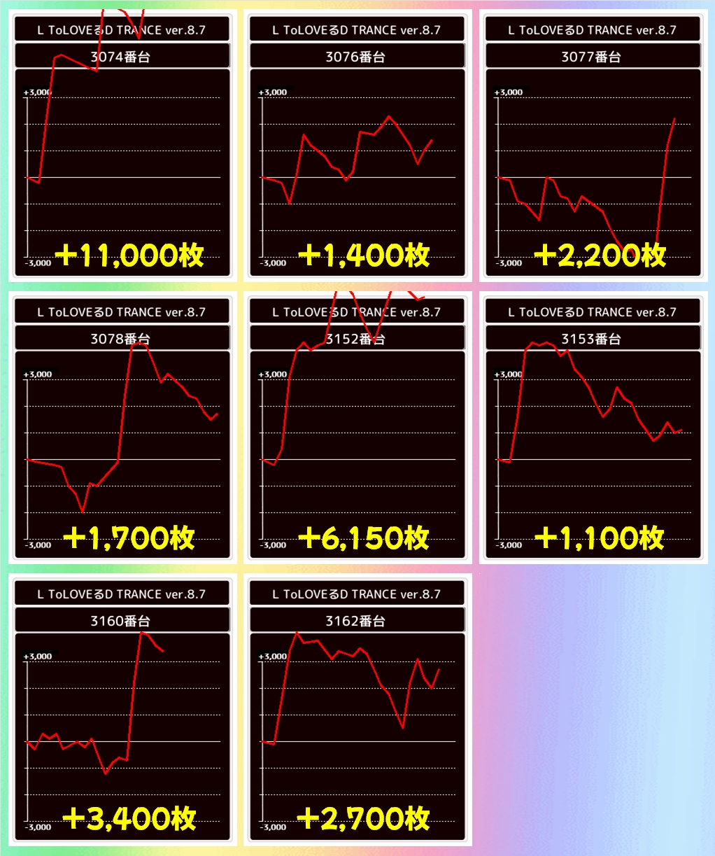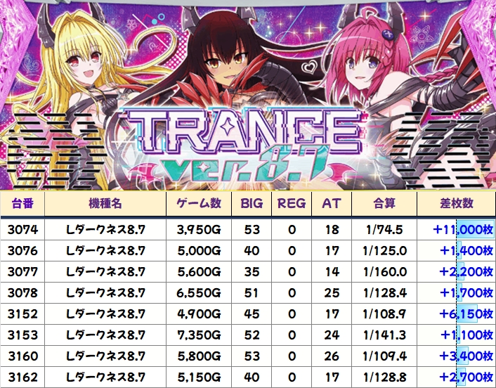 この日は大人気機種のToLOVEる・ToLOVEるトランス・東京喰種・マギレコの4機種からも大量出玉が飛び出しており、ToLOVEるトランスからは万枚オーバー台が出現!